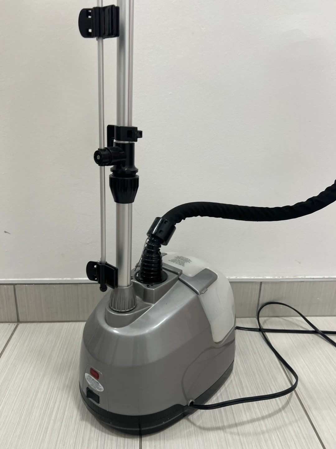 This CONAIR standing garment steamer has a fabric brush attachment. It features a large water tank and a hanger system. It's great for refreshing clothes and removing wrinkles.