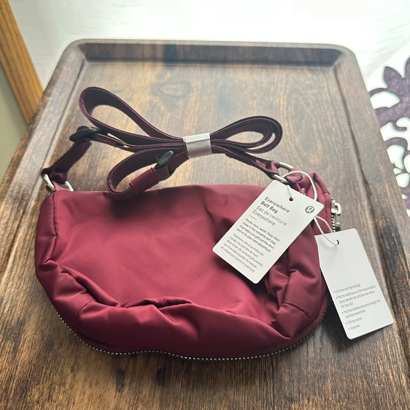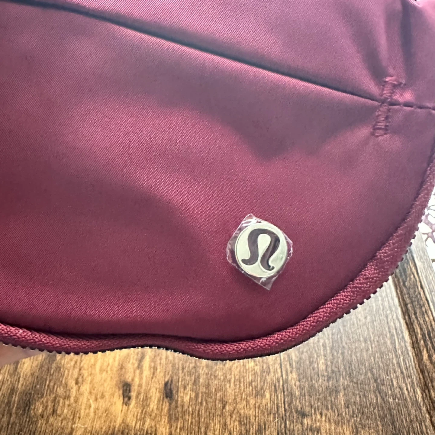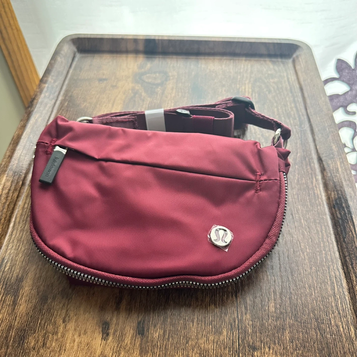 This Lululemon Everywhere Belt Bag is in a rich burgundy color. It's made of durable nylon and features a zippered main compartment with an interior slip pocket. Perfect for hands-free adventures!