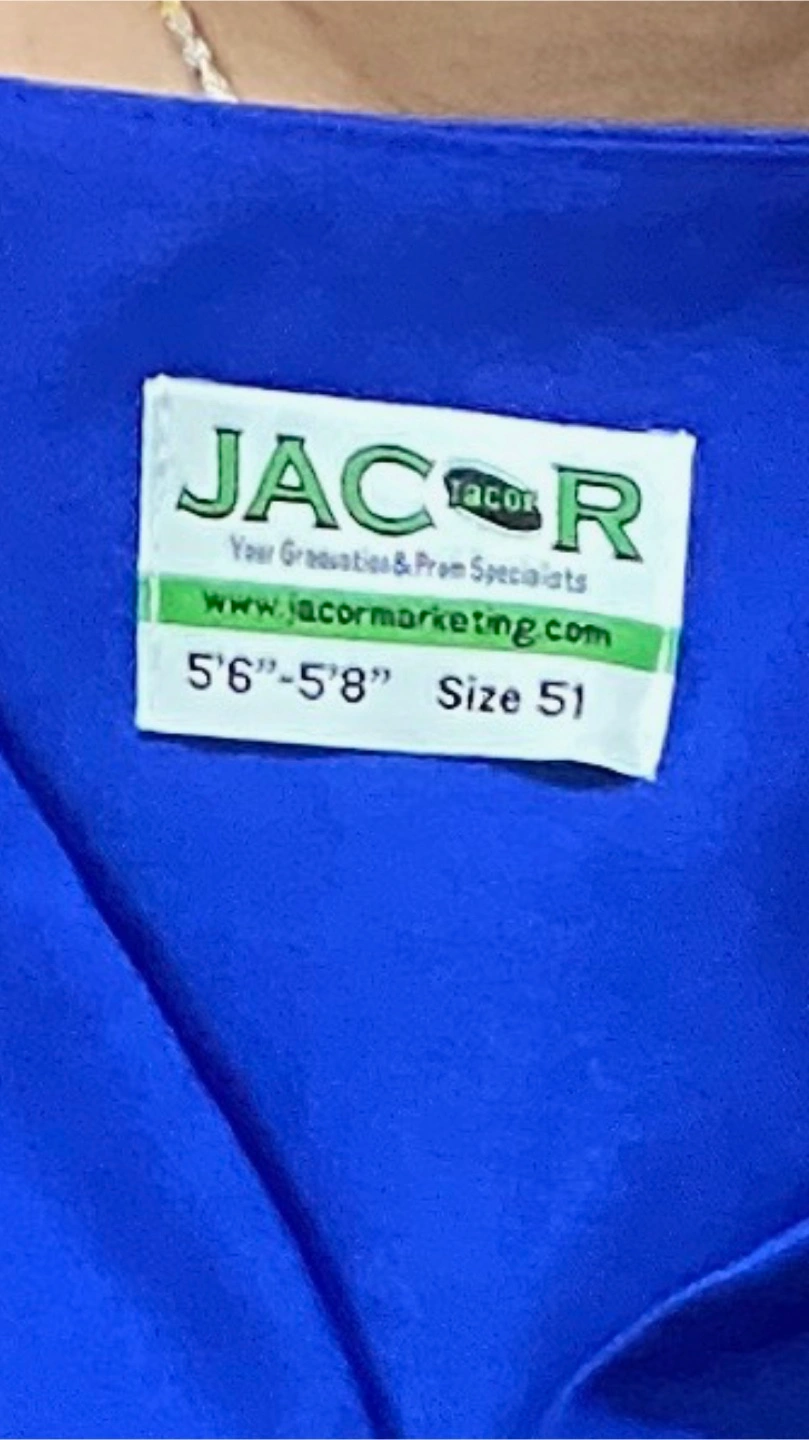 Here's a Jacor graduation gown in blue, size 51. It's suitable for someone between 5'6" and 5'8". Comes with the cap too! Wore just once yesterday.