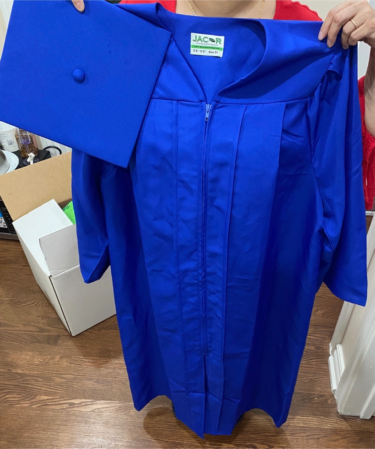 Here's a Jacor graduation gown in blue, size 51. It's suitable for someone between 5'6" and 5'8". Comes with the cap too! Wore just once yesterday.