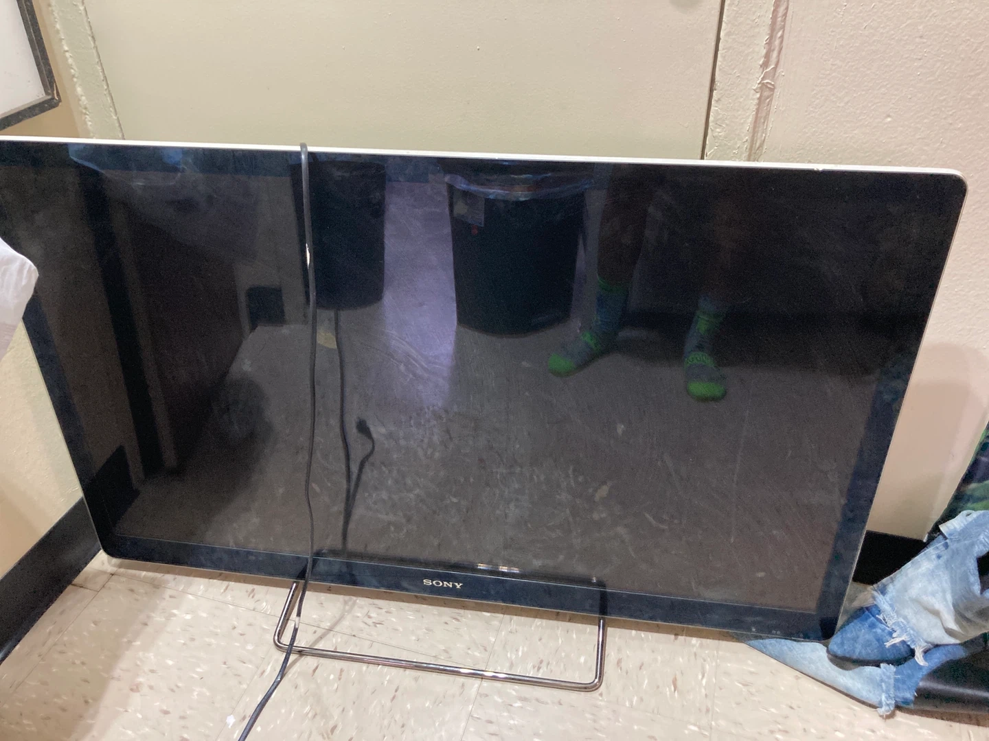 This is a Sony flat screen television. It's white on the back and comes with a stand. The screen is black.