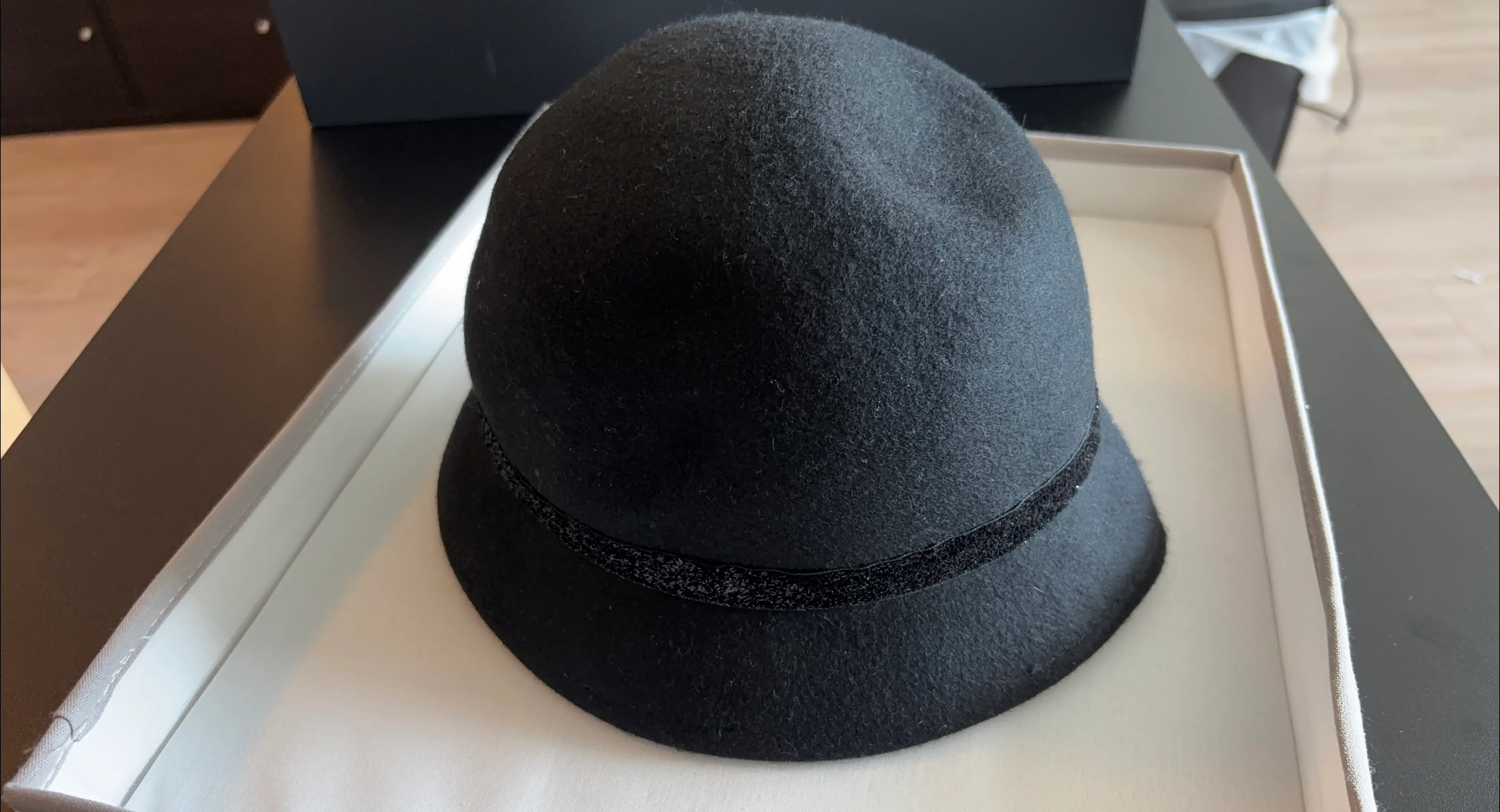 Selling a stylish black wool cloche hat. It's in great condition and comes with its original box. Perfect for adding a touch of elegance to any outfit!