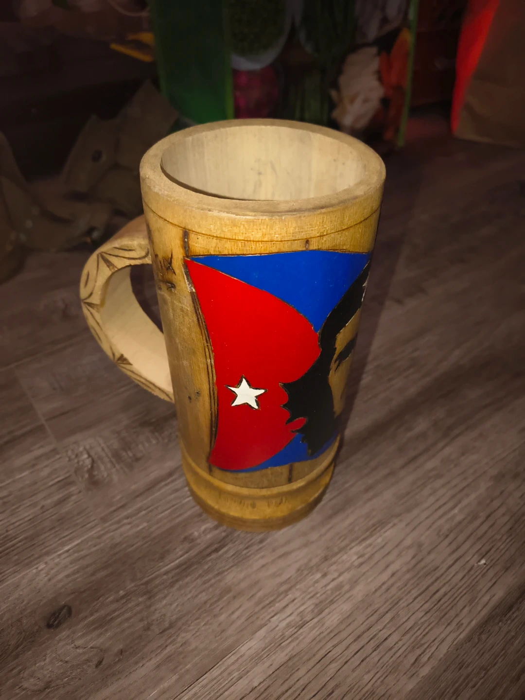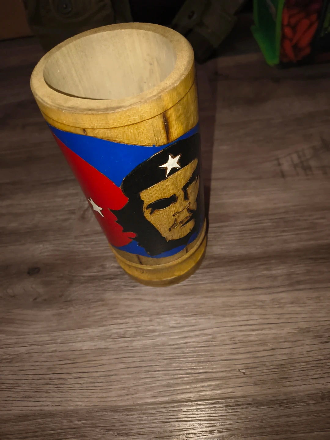 This wooden mug features a painted design of Che Guevara and the Cuban flag. It has a unique carved handle. Perfect for displaying or for a unique beverage holder!