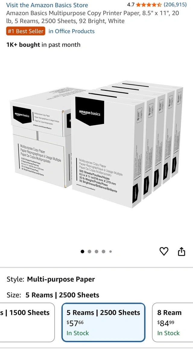 Selling a new ream of Amazon Basics multipurpose copy paper, containing 2,500 sheets of 8.5 x 11 inch, 20 lb, 92 bright white paper. Ideal for printing, copying, and everyday use. Cash accepted.