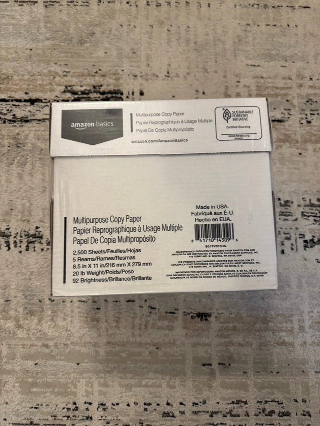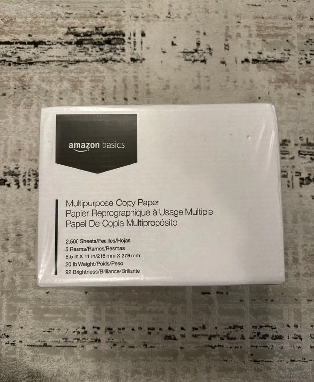 Selling a new ream of Amazon Basics multipurpose copy paper, containing 2,500 sheets of 8.5 x 11 inch, 20 lb, 92 bright white paper. Ideal for printing, copying, and everyday use. Cash accepted.