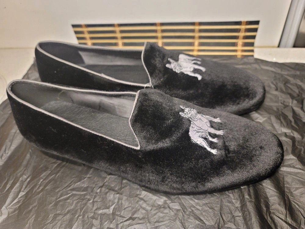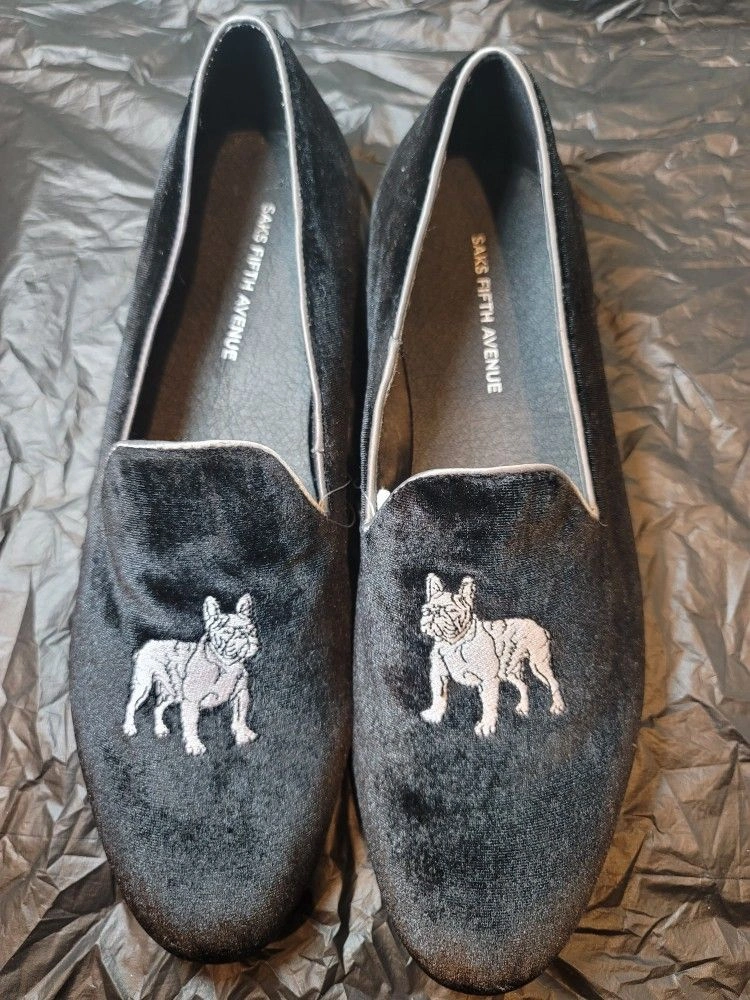This awesome shoes has a Pug design . Perfect for any dog lover , 100% black velvet and leather