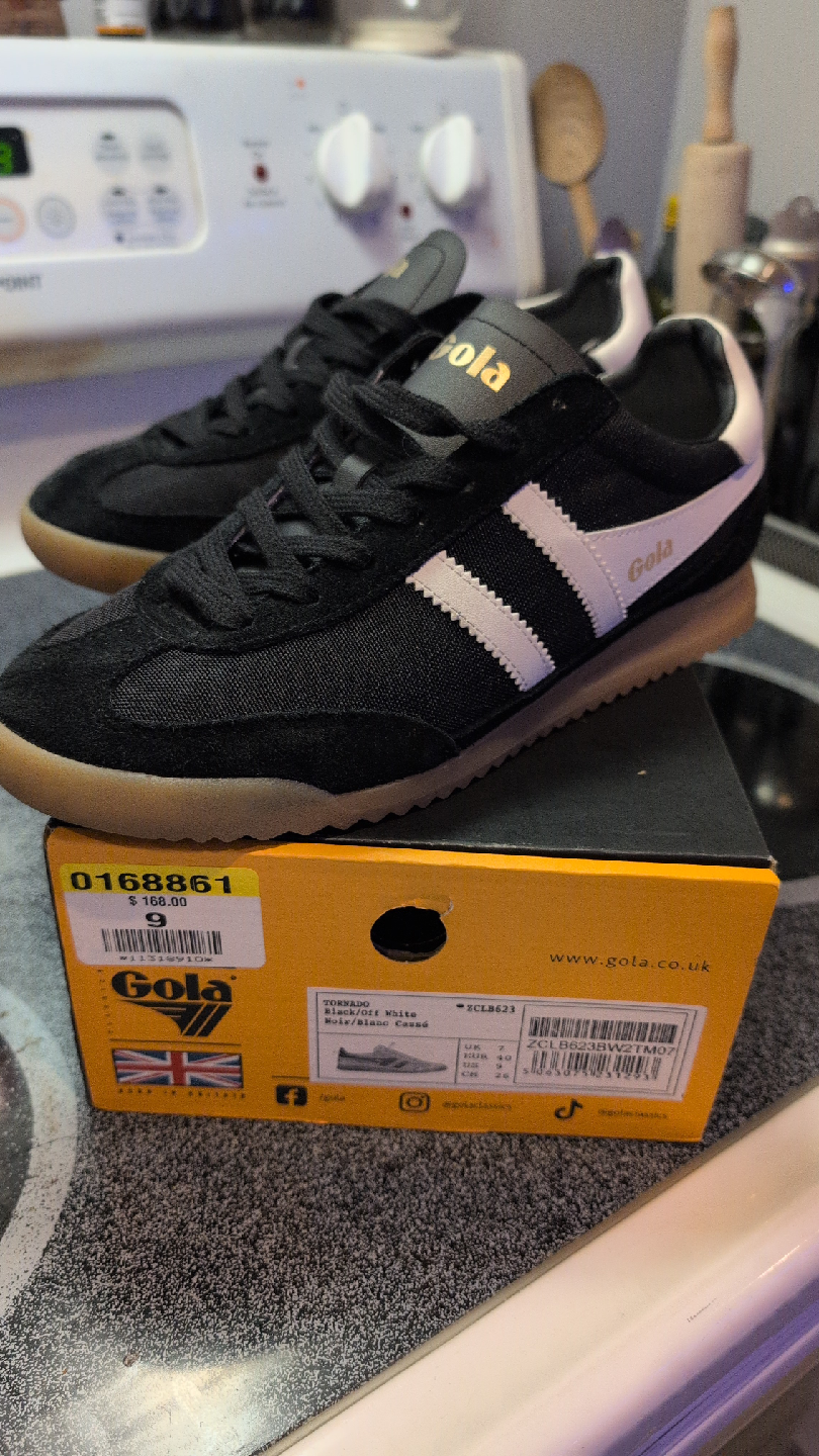 Selling a pair of Gola Tornado sneakers in black and off-white. They've been worn once and come with the original box! Size is a US 9. Originally bought for $168.