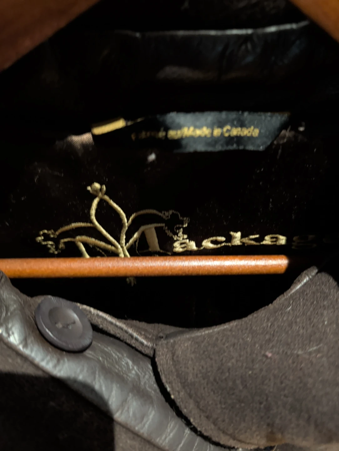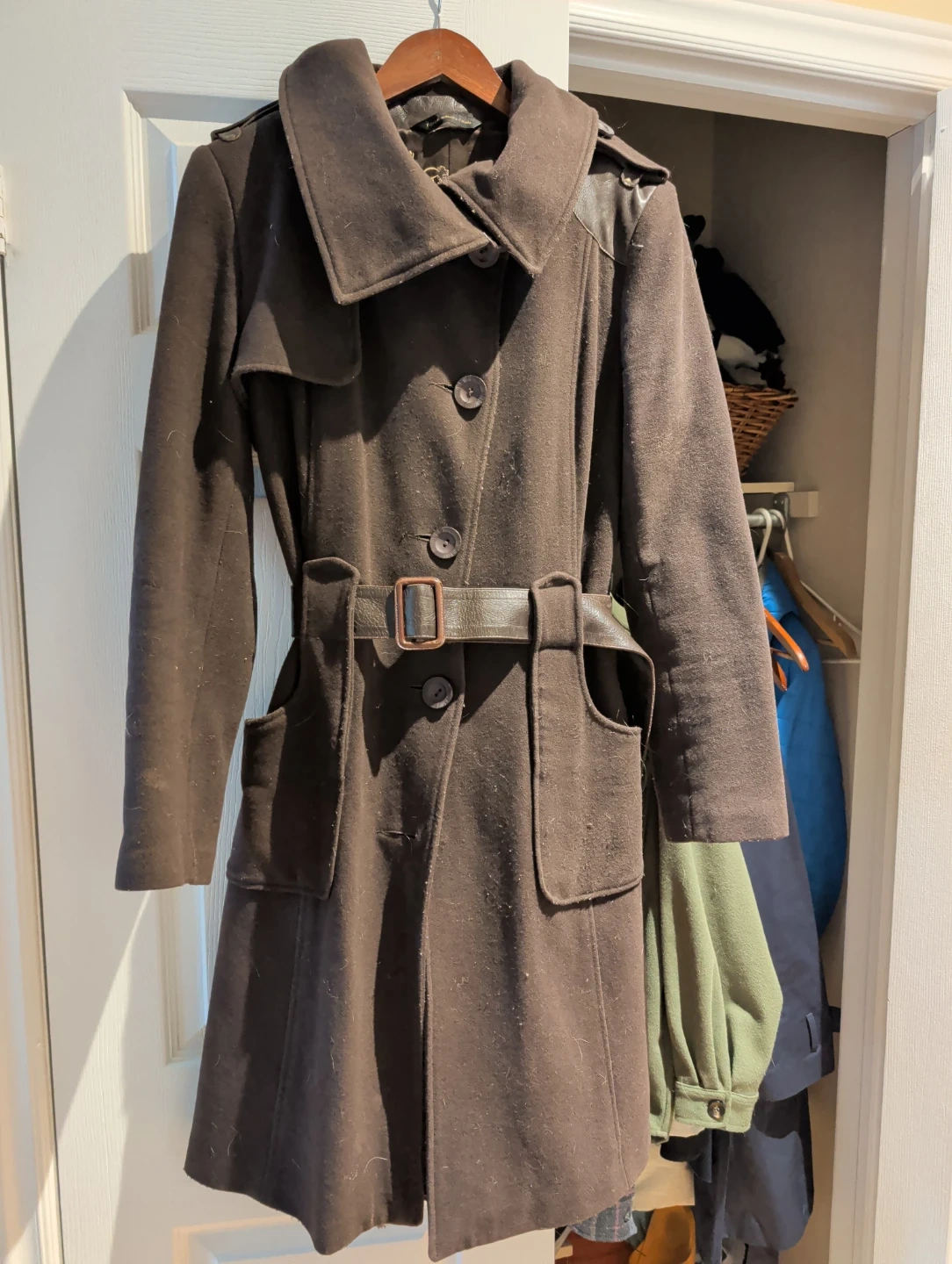 A stylish Mackage trench coat made from a wool blend. It's a beautiful dark brown colour and comes with a matching belt for a cinched waist. This coat features a classic trench style with button closure and leather-look accents on the collar.