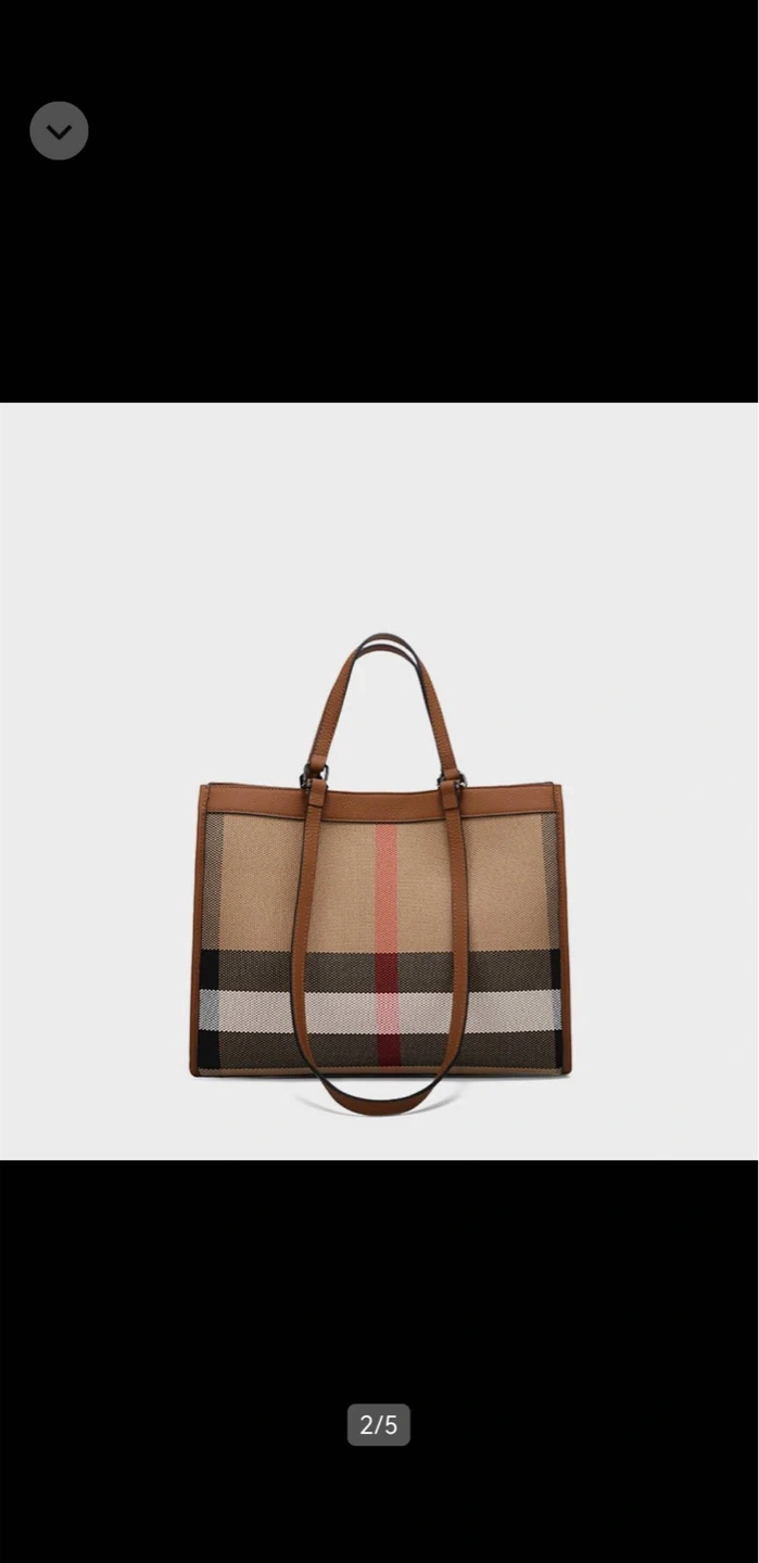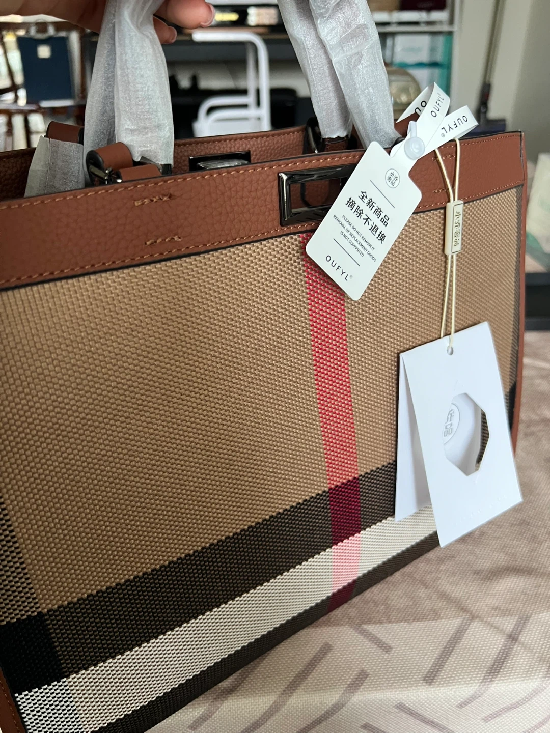 This OUFYL tote bag features the brand's signature plaid pattern with brown leather accents. It's a spacious bag, perfect for everyday use. The bag comes with protective wrapping still on the handles.
