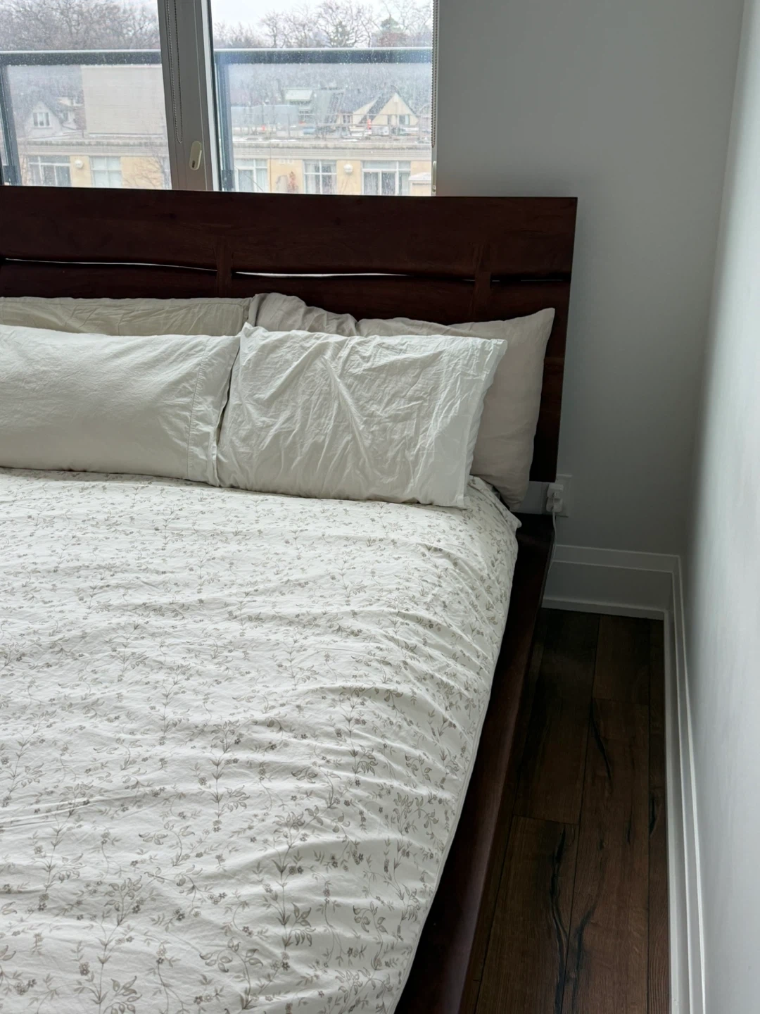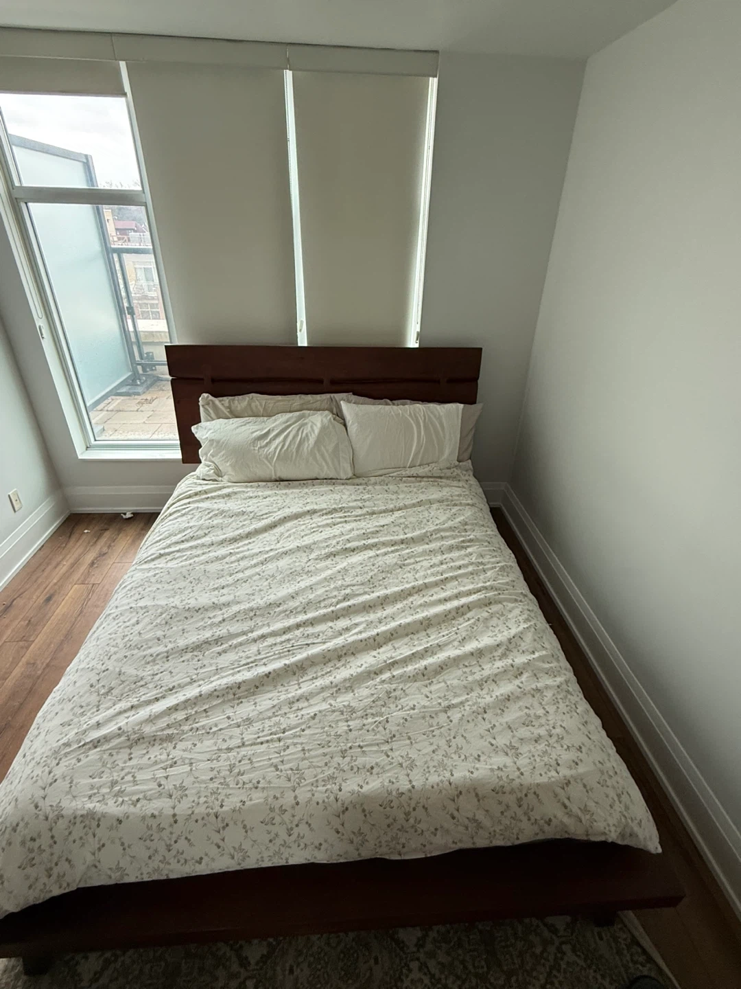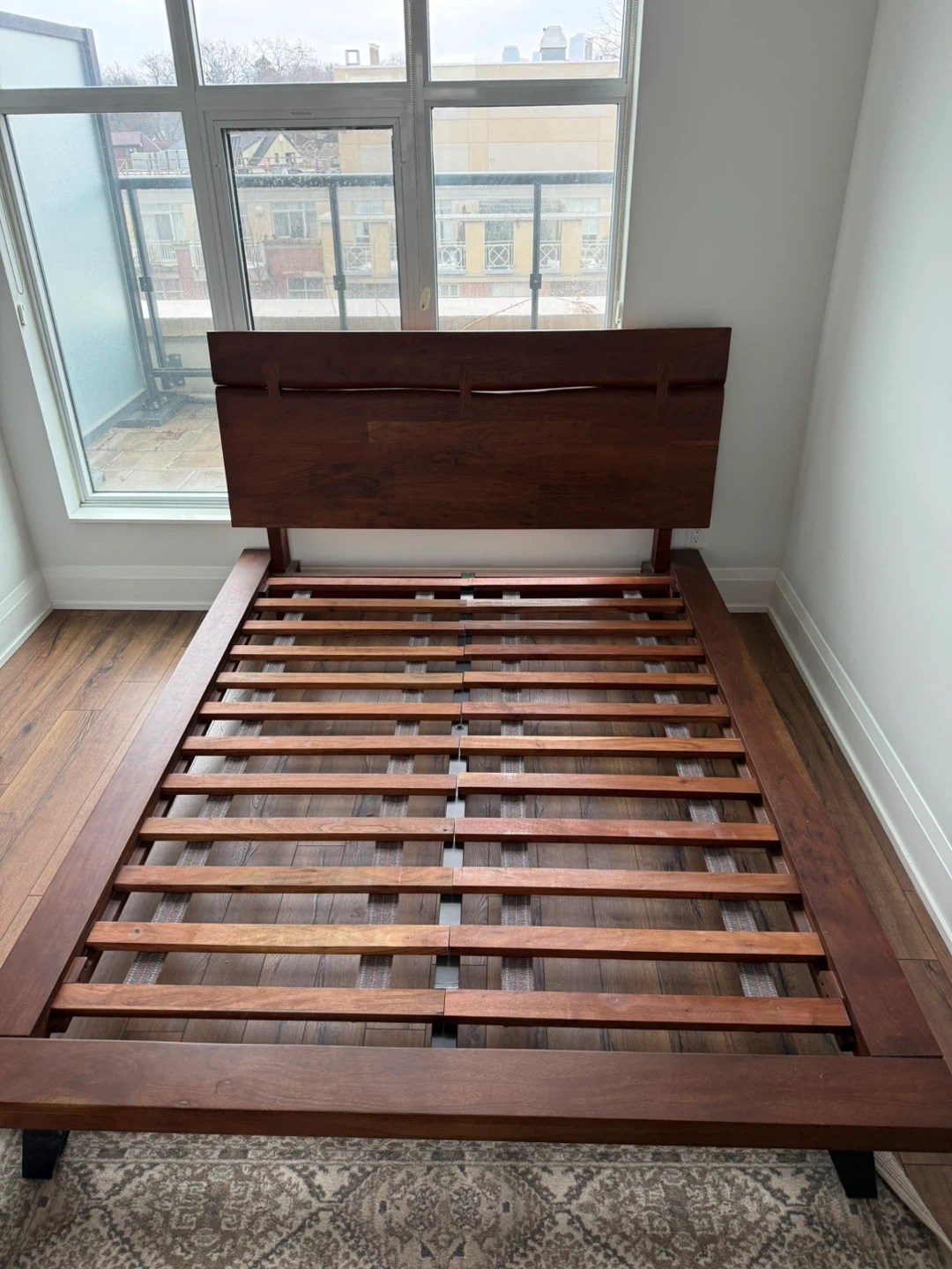 QUEEN - STRUCTUBE JAPANESE CHEERY WOOD solid wood bed frame with a modern headboard. Wooden slats provide mattress support. Dark wood finish. Purchased April 2023 for $1,100. Selling due to a move