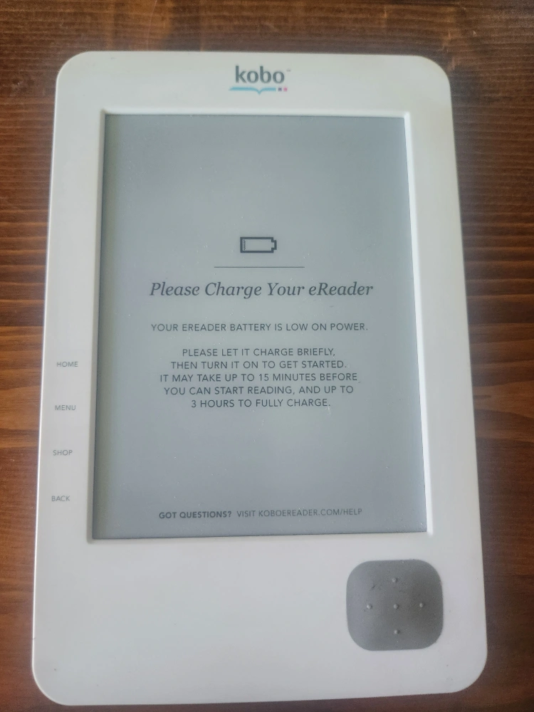 Purple Kobo eReader. It has a micro USB port and an SD card slot. It is in good condition and works perfectly.