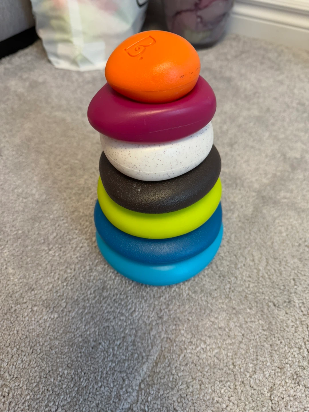 This is a fun and colourful B. Toys Rock Stack toy! It’s in great condition and ready for a new little one to enjoy. Perfect for developing hand-eye coordination and motor skills