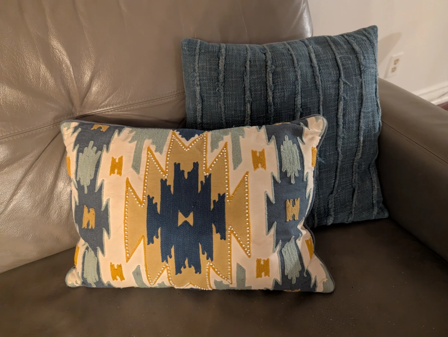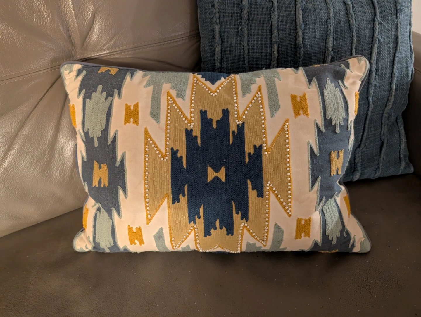 Add a pop of colour to your living room with these 2 textured decorative throw pillow! The pillow features a unique geometric pattern, beads, with colours of blue, beige, and yellow. It's in great shape and ready to brighten up your space