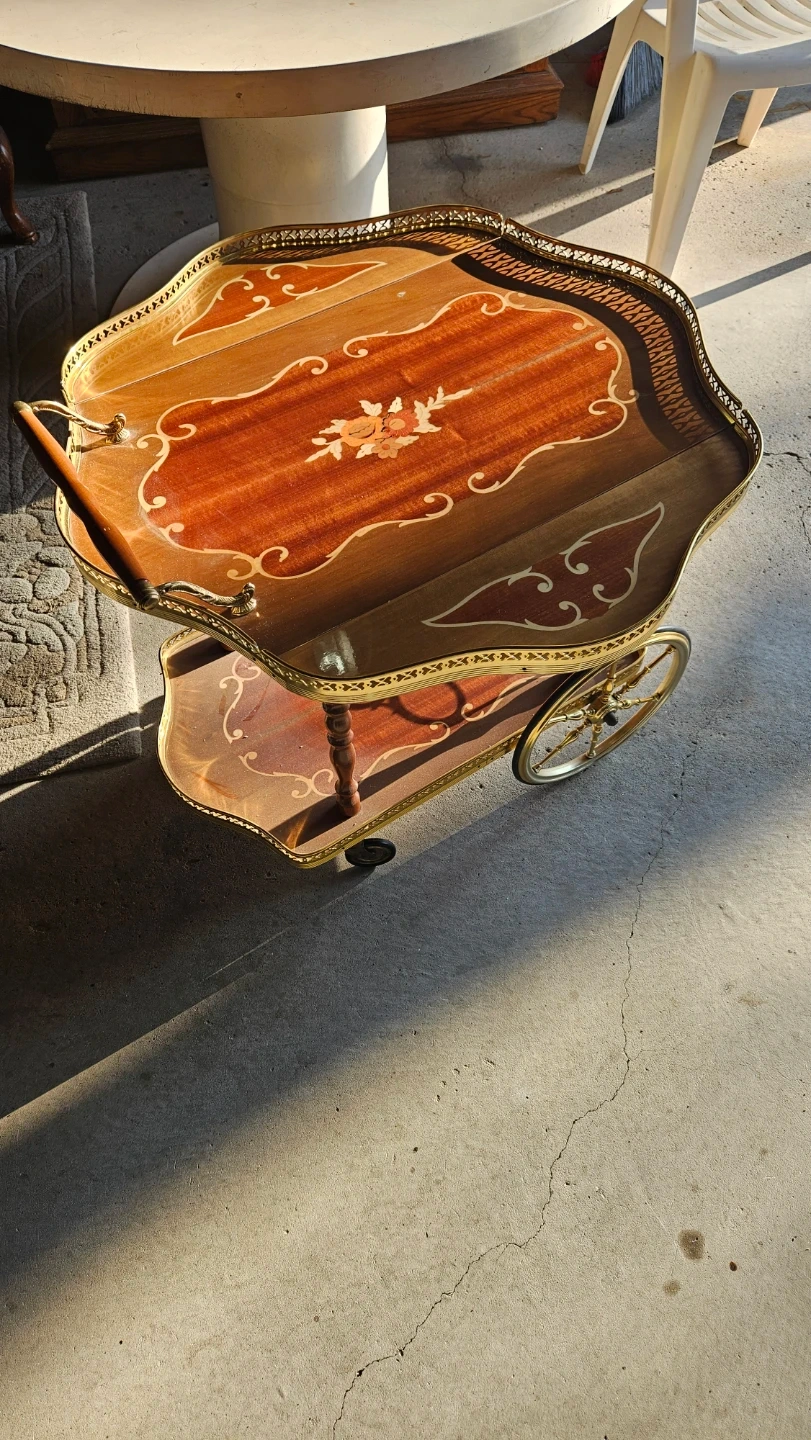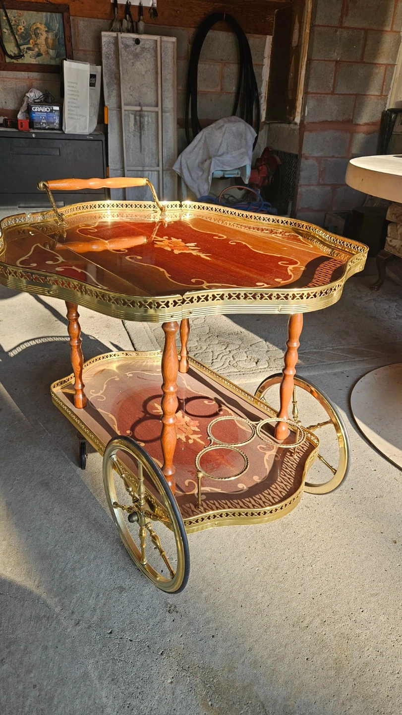 Elevate your home bar with this stunning authentic Italian Marquetry Tea/Bar Cart. Produced in the mid-20th century (c. 1960s–70s), this piece is a beautiful example of Sorrento-style craftsmanship, featuring intricate floral wood inlays (marquetry) on both the top and bottom tiers.