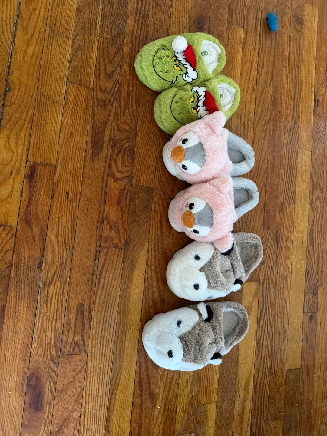 pairs of plush slippers. Grinch-themed slippers size kids 2-3, two pink owl slippers women 6.5- 7.6, and two brown and white animal slippers 9.5- 10.5. They're soft and fuzzy!