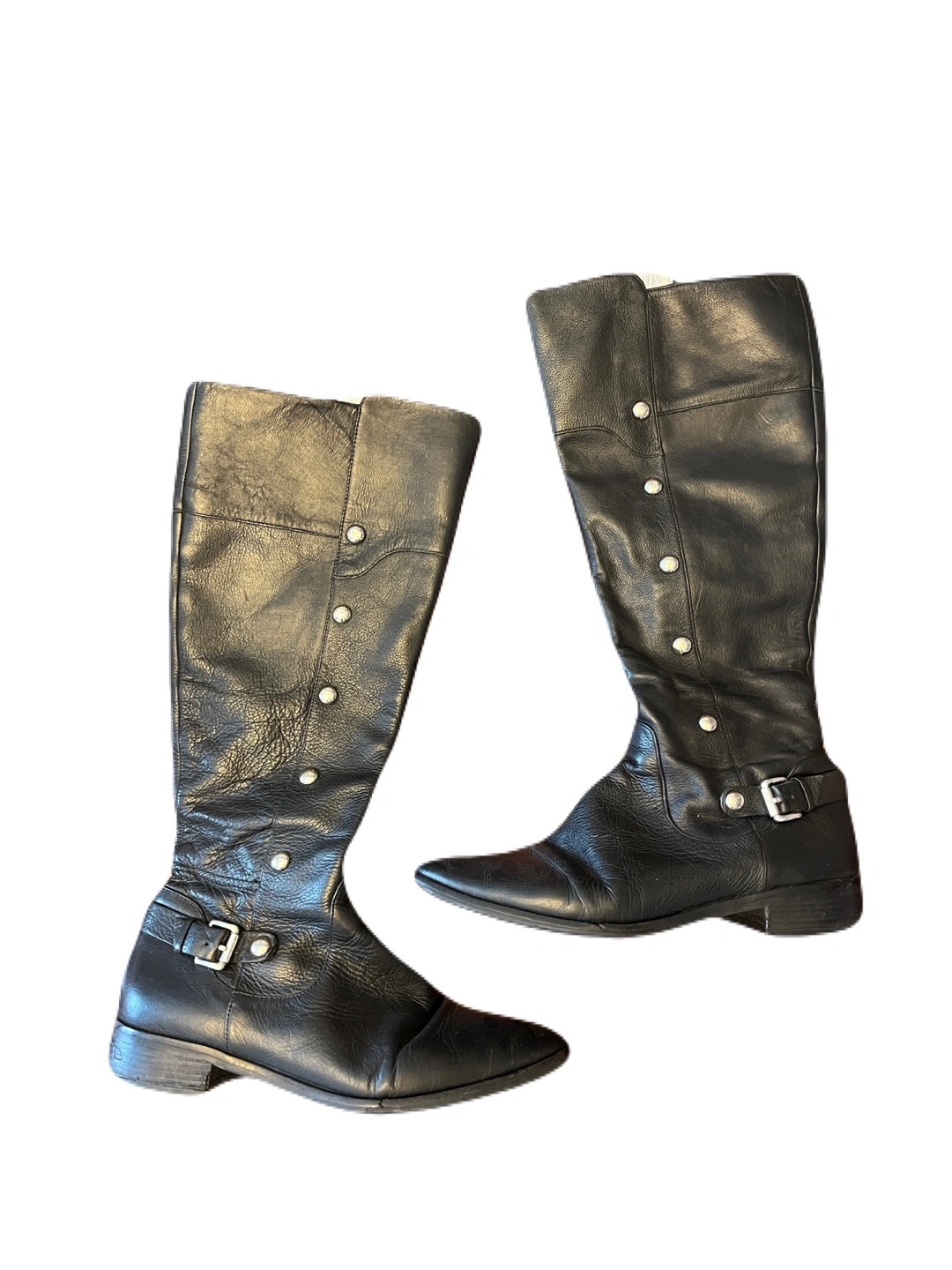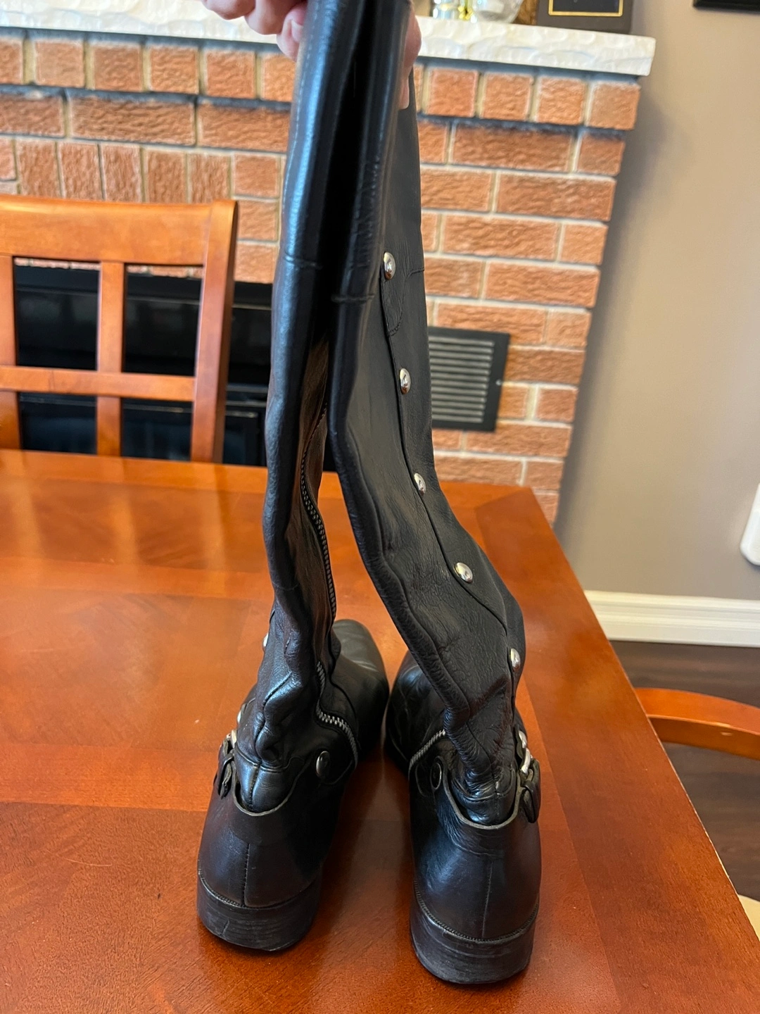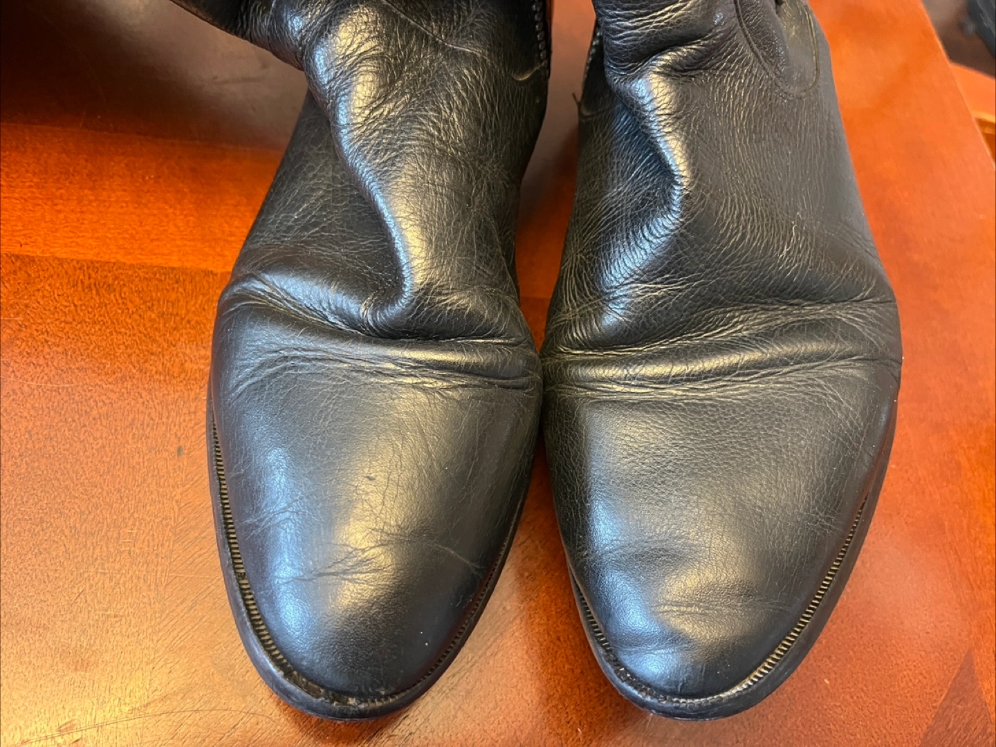 Condition notes: These are well-loved. The exterior is in good condition with signs of wear such as creases in the leather, and wear in the soles and heels, but there is plenty of life left. The interior lining shows peeling and noticeable wear, and in one spot there is a rip in the inside lining. This does not affect the outer appearance or general wearability.