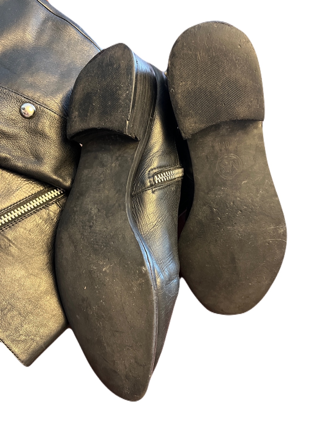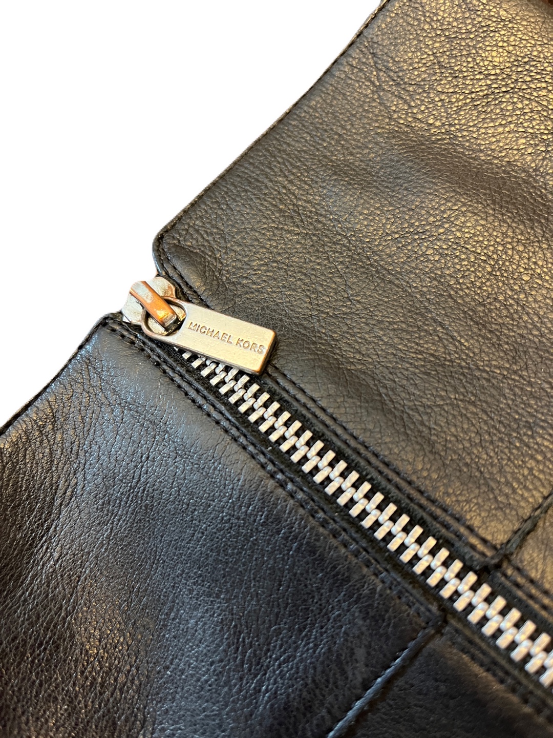 High-quality black leather. Silver studded details and signature MK hardware. Zip up closure.