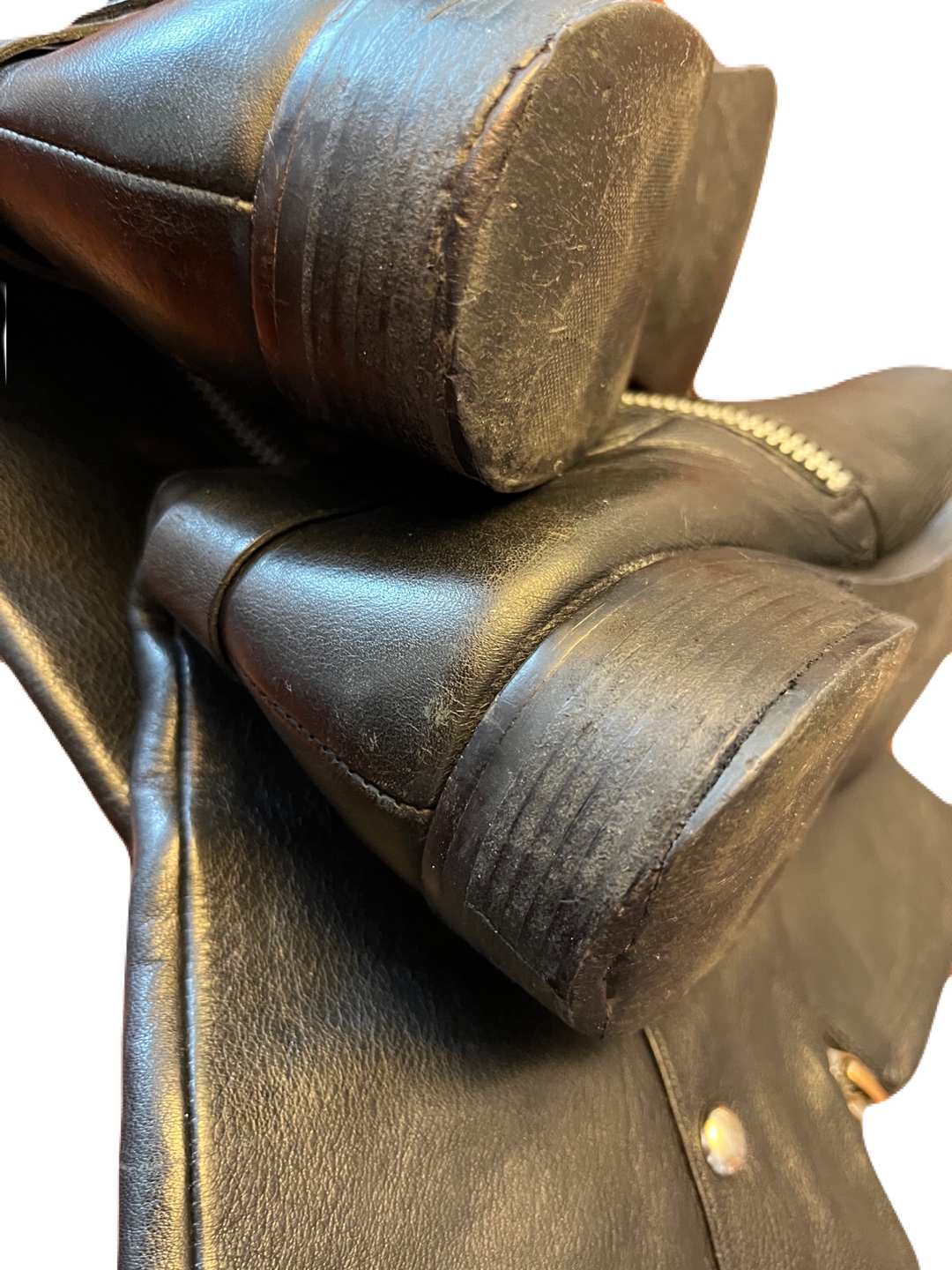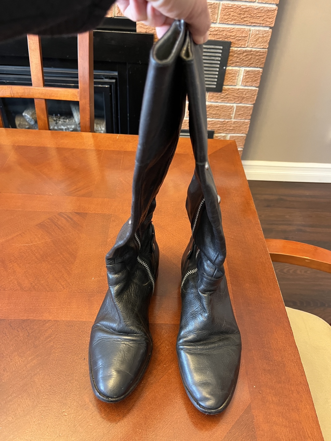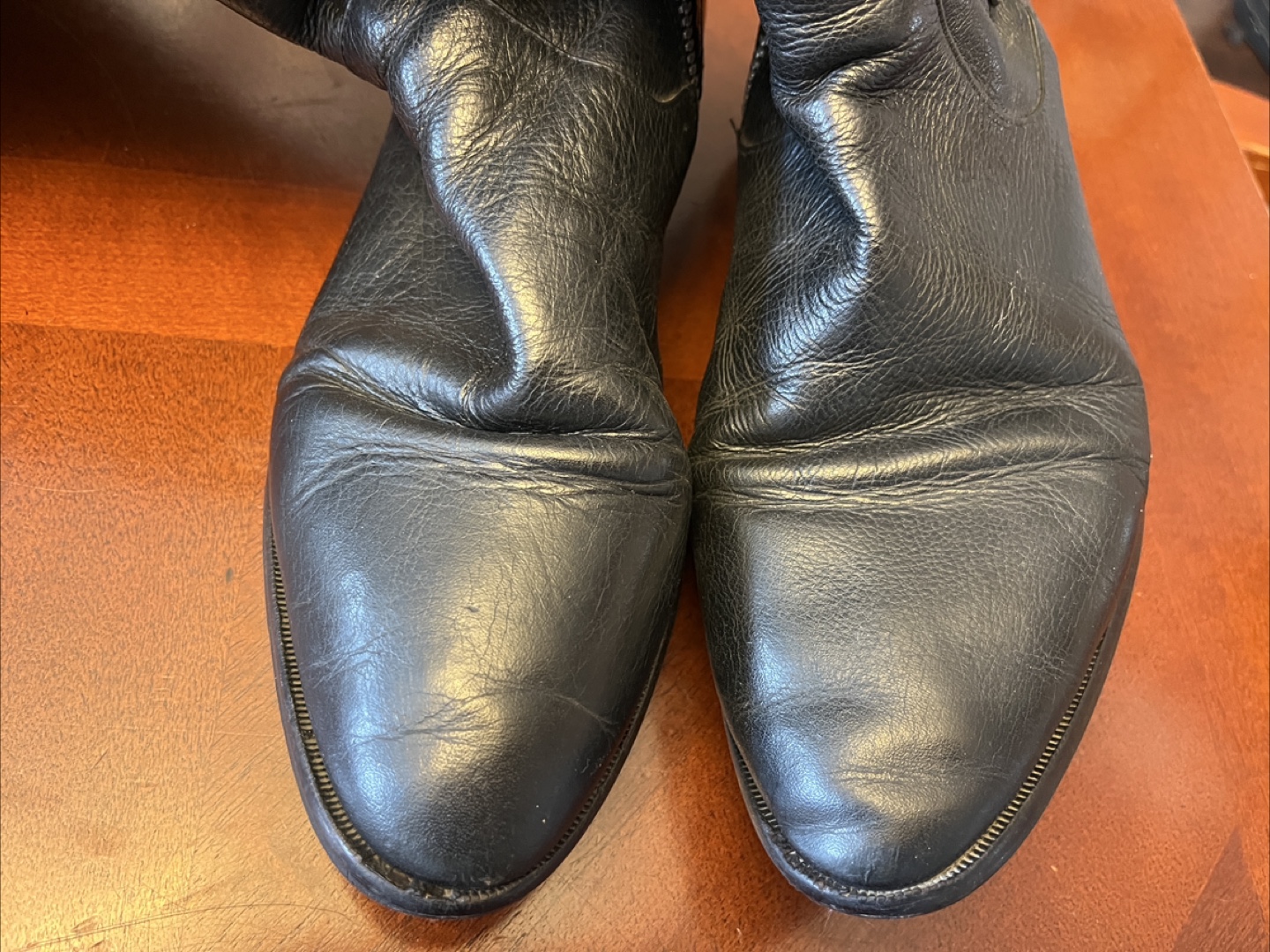 Condition notes: These are well-loved. The exterior is in good condition with signs of wear such as creases in the leather, and wear in the soles and heels, but there is plenty of life left. The interior lining shows peeling and noticeable wear, and in one spot there is a rip in the inside lining. This does not affect the outer appearance or general wearability.
