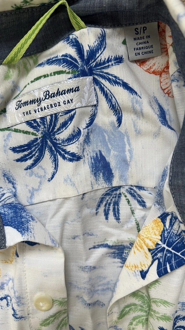 This is a used Tommy Bahama Veracruz Cay Hawaiian shirt, size small. It features a vibrant tropical print perfect for a casual, relaxed look. Additional details include: