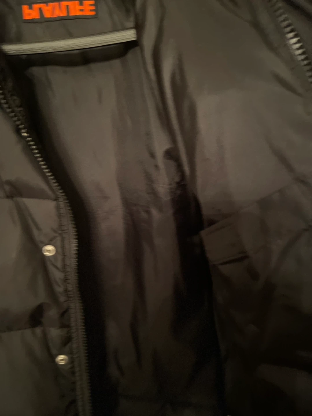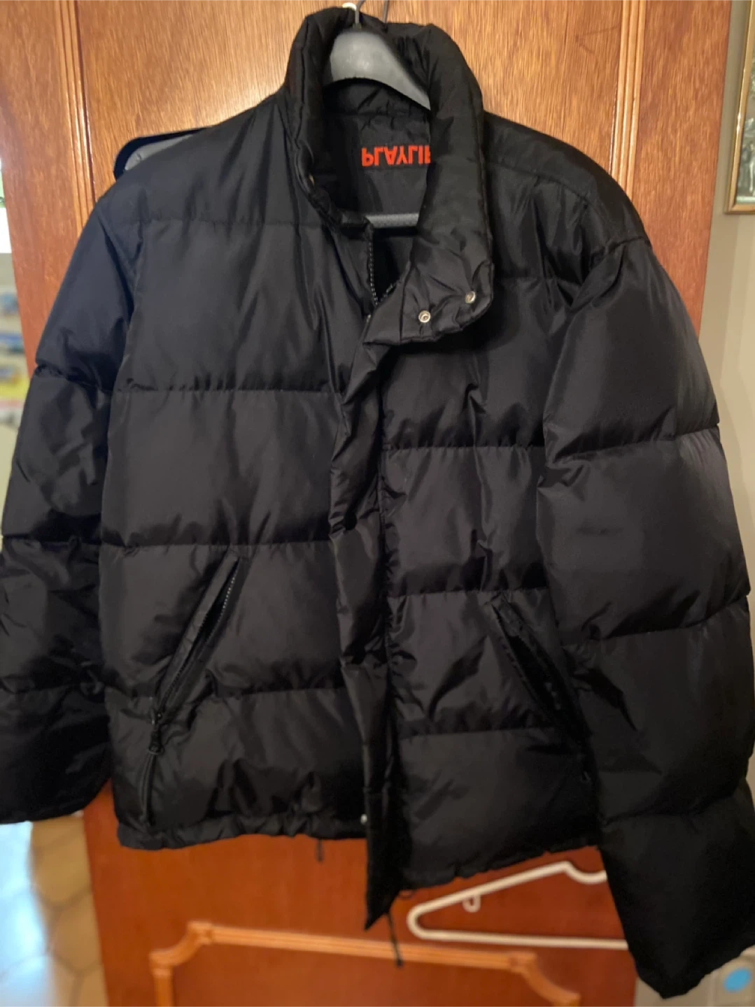 This is a gently used black puffer jacket from Brave Soul. It's a size M and made in China. The outer shell is made of polyamide/nylon, and the inner lining is 100% polyester. The stuffing is feather/down