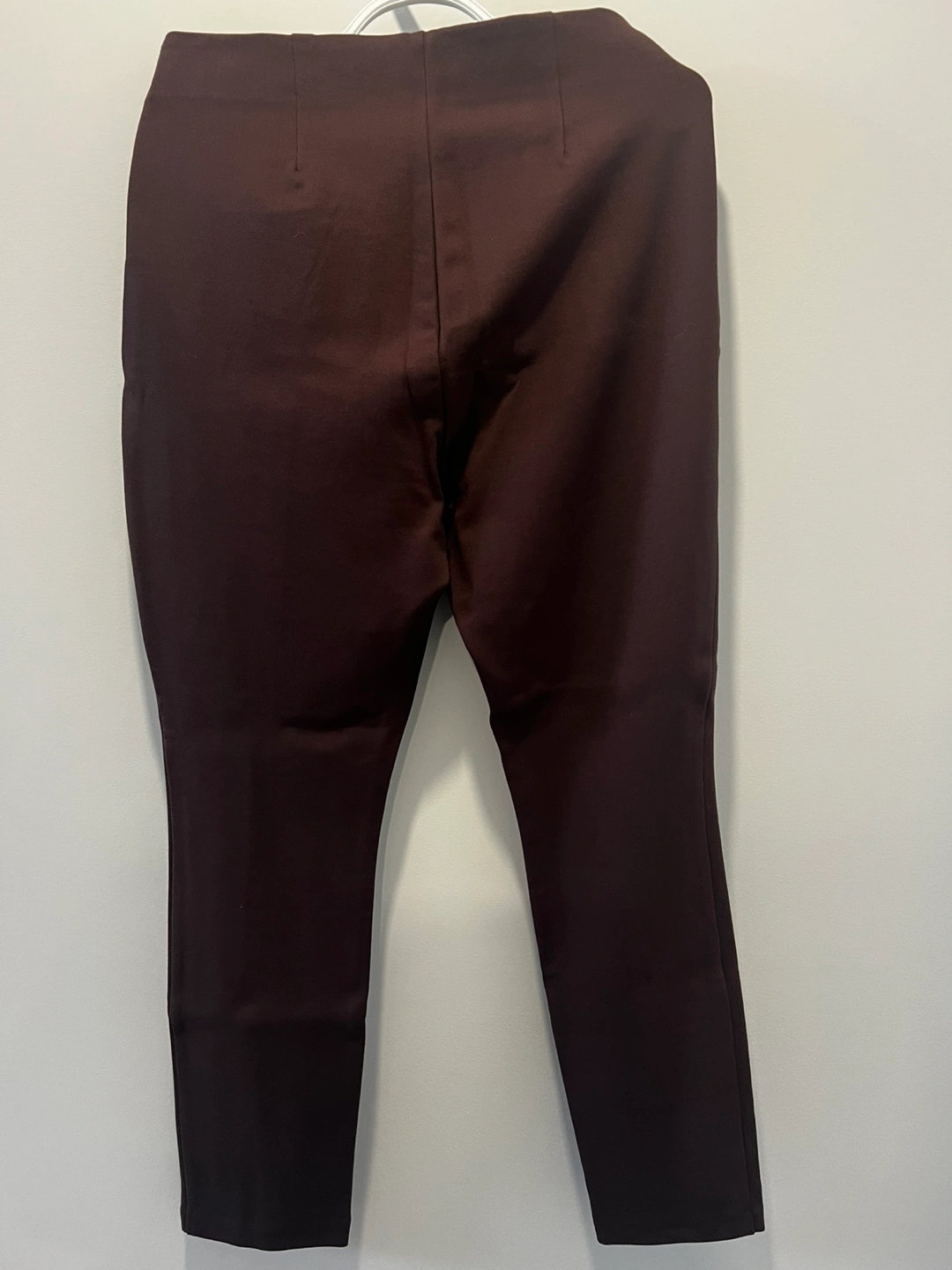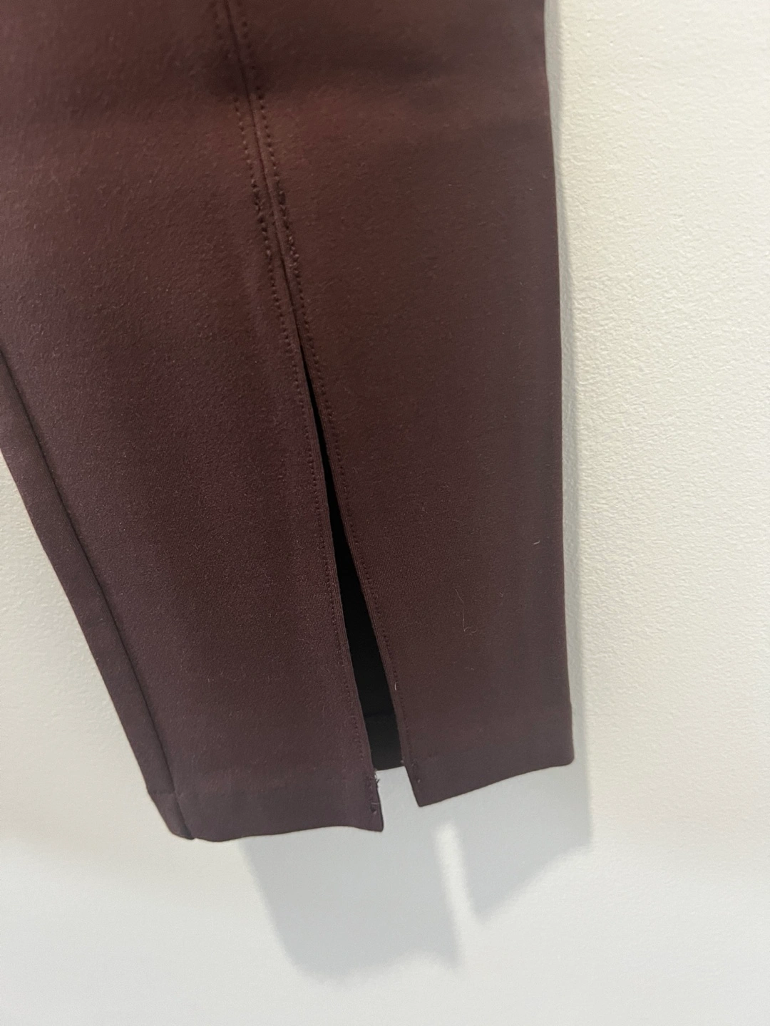 These are GAP stretch pants in a deep maroon colour. They're a size 10 with a comfortable elastic waistband and a stylish split hem. Material is a blend for flexibility.