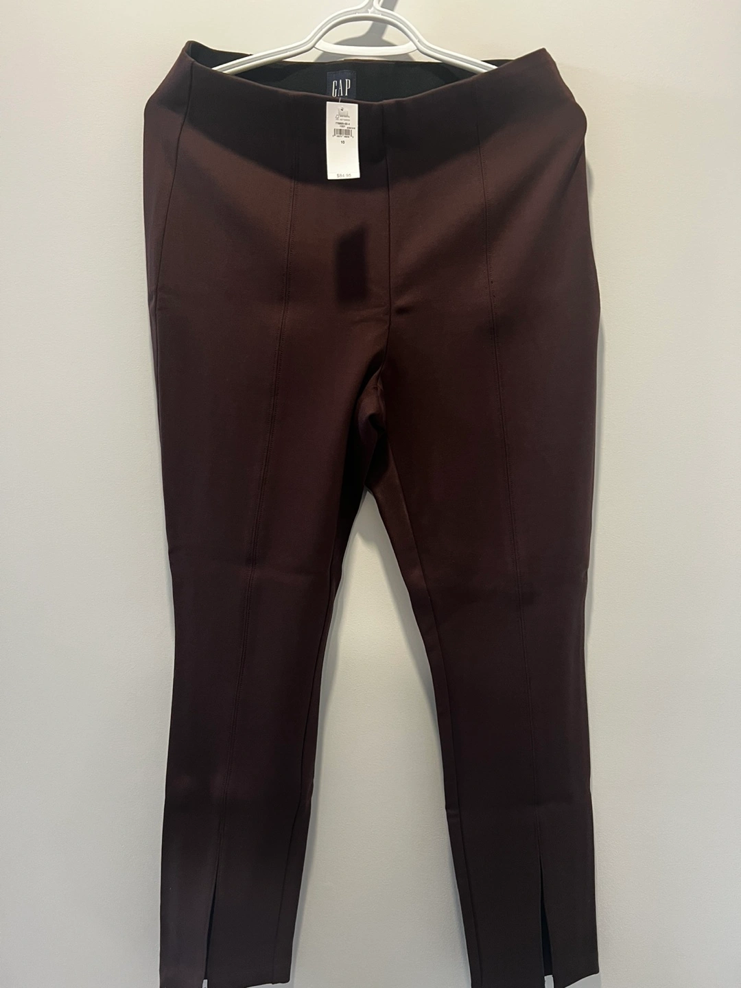 These are GAP stretch pants in a deep maroon colour. They're a size 10 with a comfortable elastic waistband and a stylish split hem. Material is a blend for flexibility.