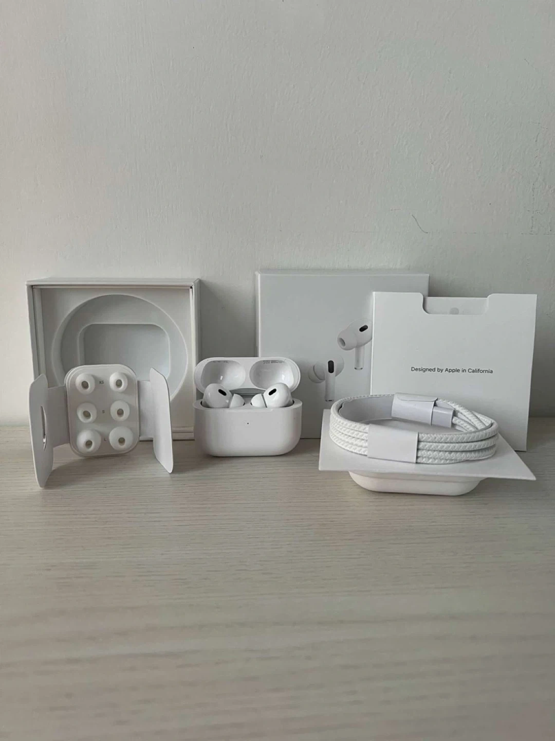 Apple AirPods Pro (2nd generation) wireless earbuds with charging case. Comes with extra ear tips and charging cable. Designed by Apple in California.