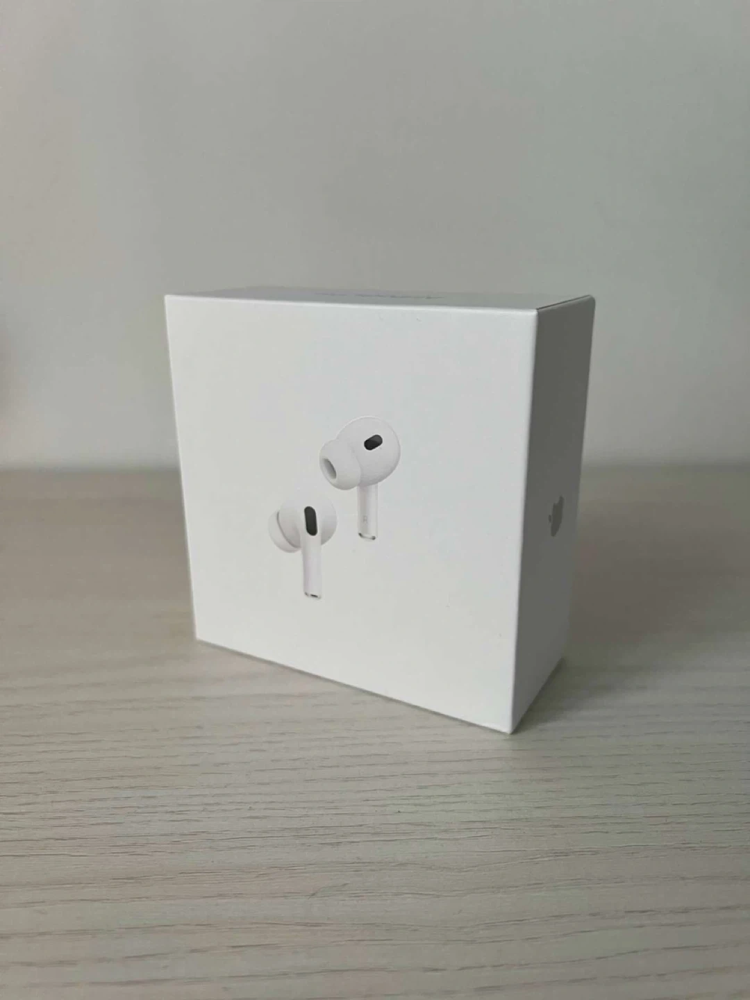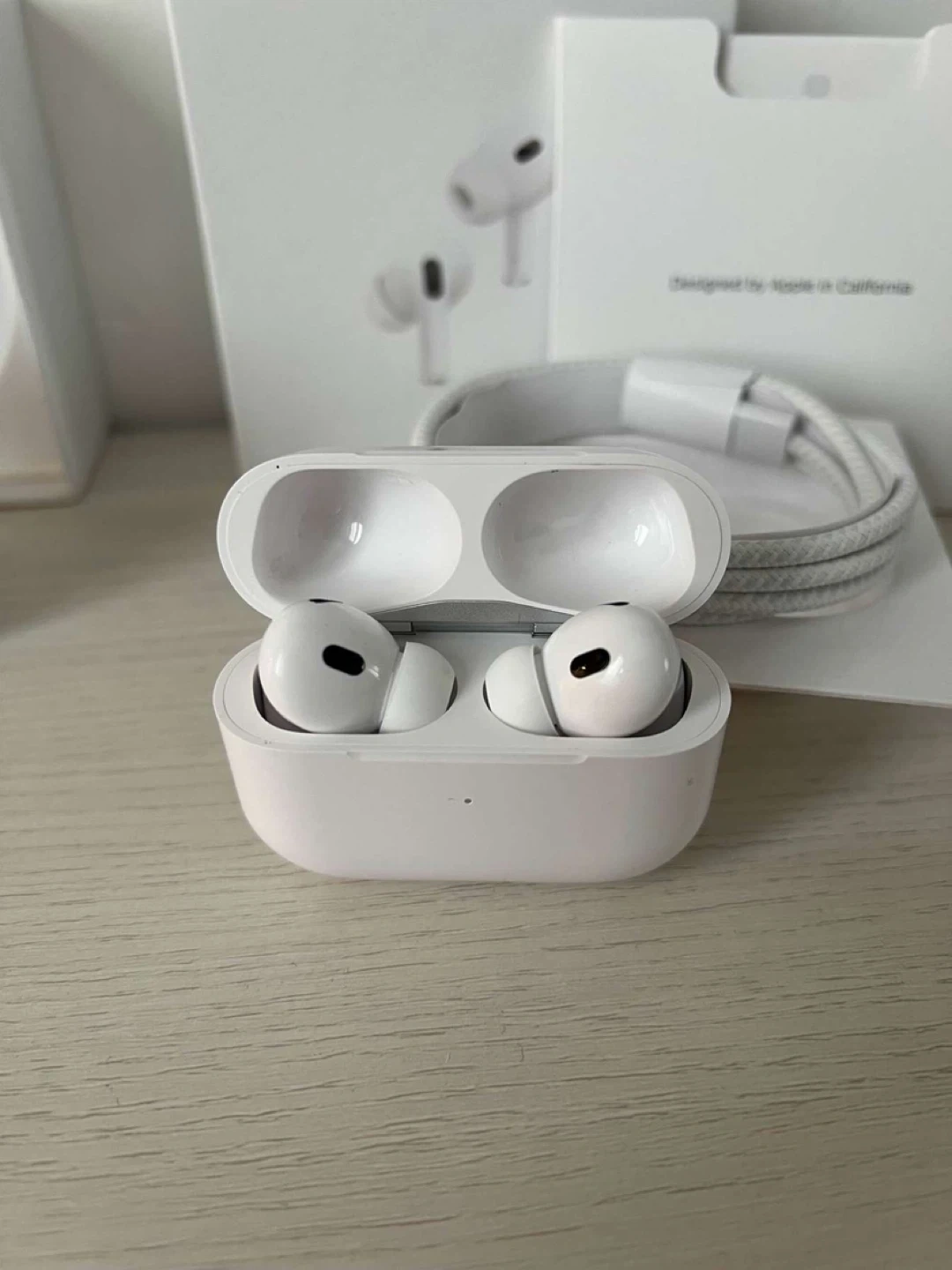 Apple AirPods Pro (2nd generation) wireless earbuds with charging case. Comes with extra ear tips and charging cable. Designed by Apple in California.