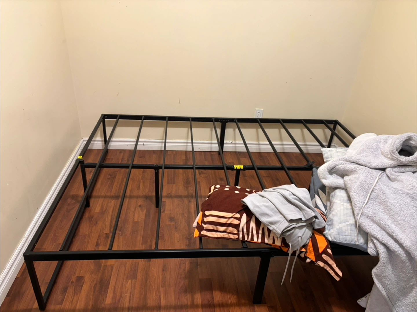 This is a sturdy black metal bed frame. It provides a solid foundation for your mattress. It's easy to assemble and ready for use. Easy to carry as it can fully compact after losing bolts