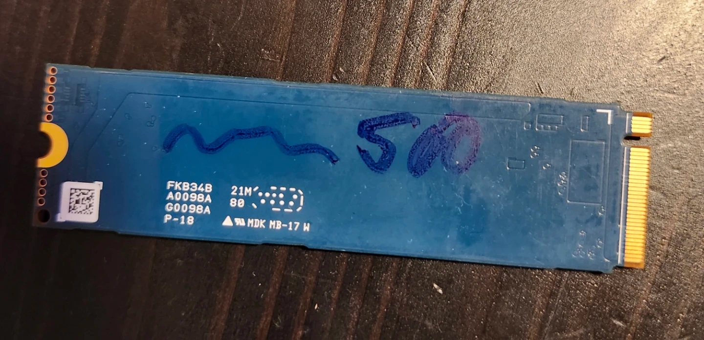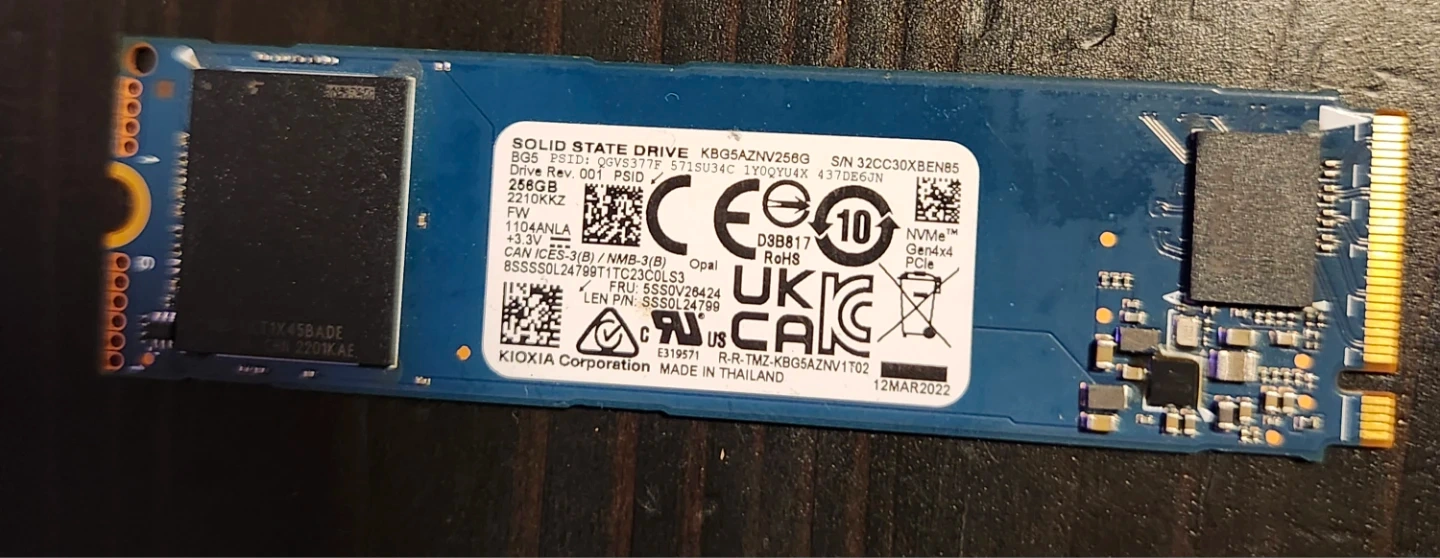 This is a Kioxia 256GB NVMe M.2 solid state drive. It's a PCIe Gen 4x4 interface. Manufactured in March 2022.