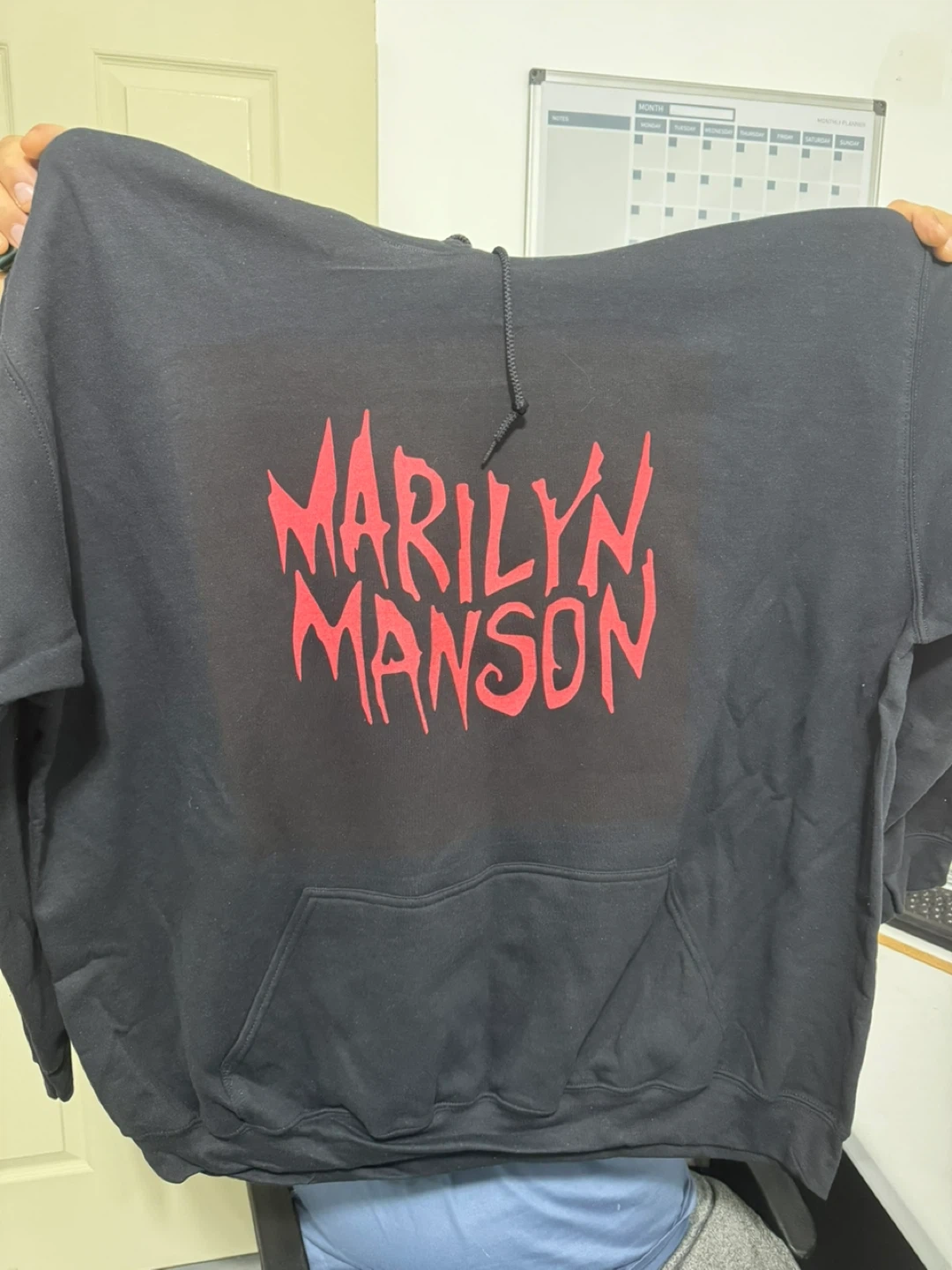 This is a black hoodie with the Marilyn Manson logo in red on the front. It's a comfortable hooded sweatshirt with a front pocket. Shows off your love for the iconic artist! We make custom hoodies and T-shirts . Hoodies are $35 and T-shirts are $20.