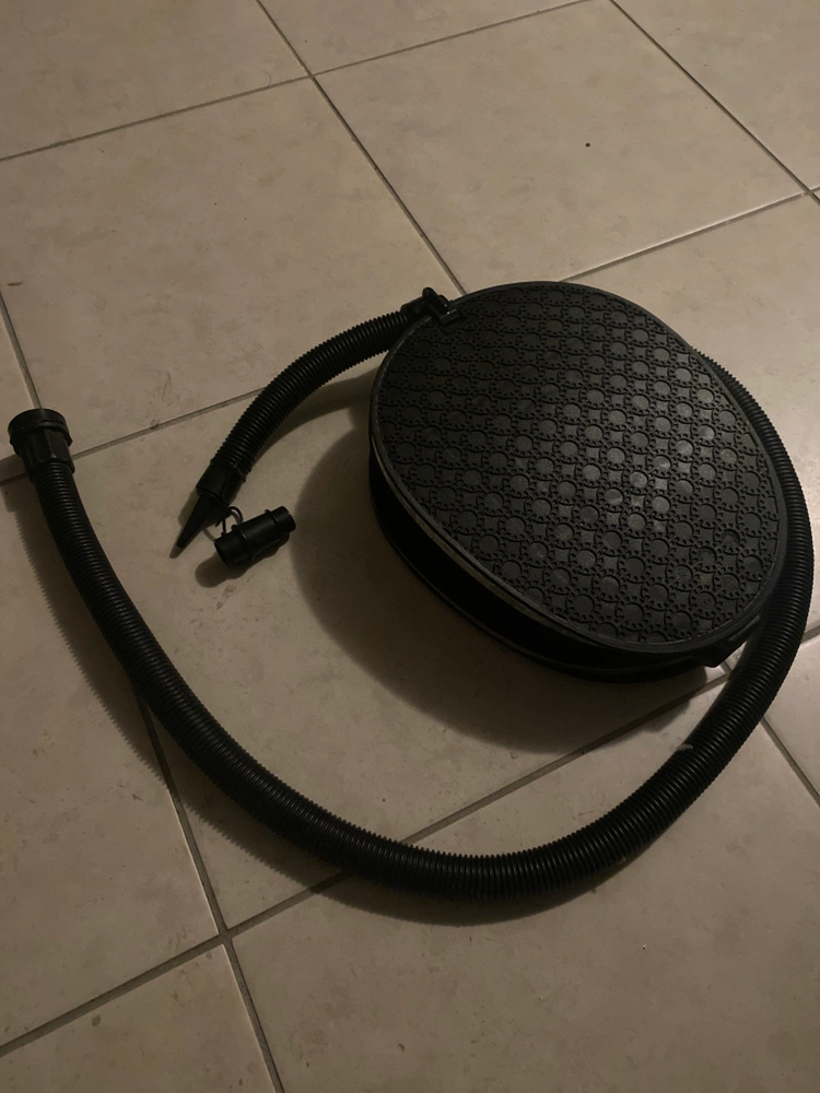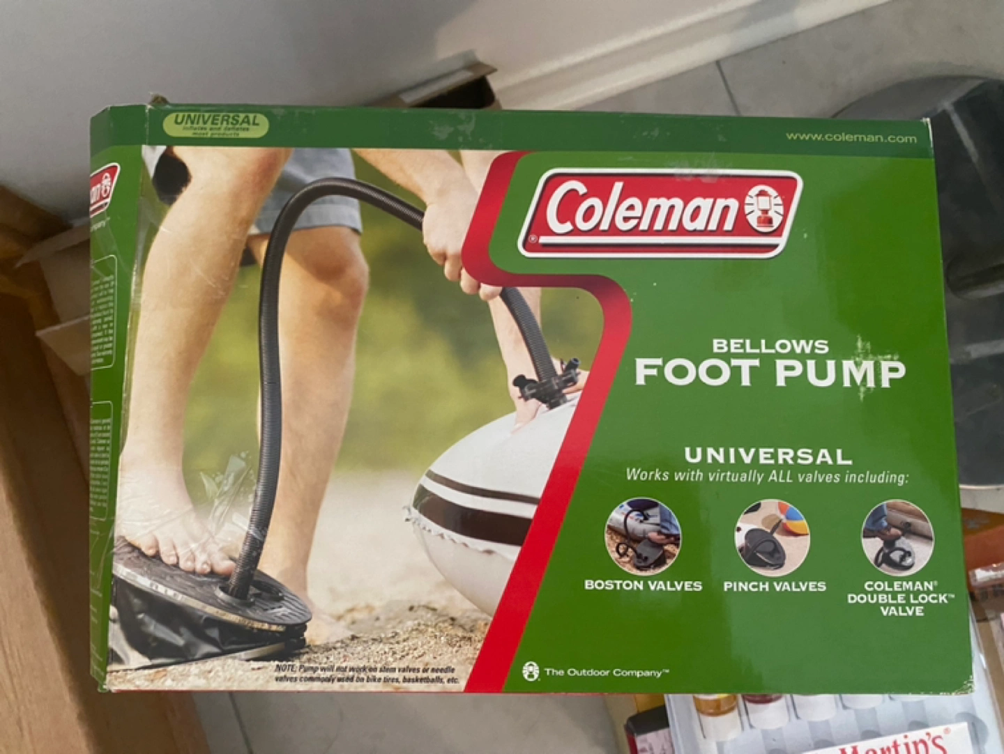 A Coleman brand bellows style foot pump. This is a pump for inflatable items such as air mattresses, beach balls and inflatable boats. Not a bike pump.