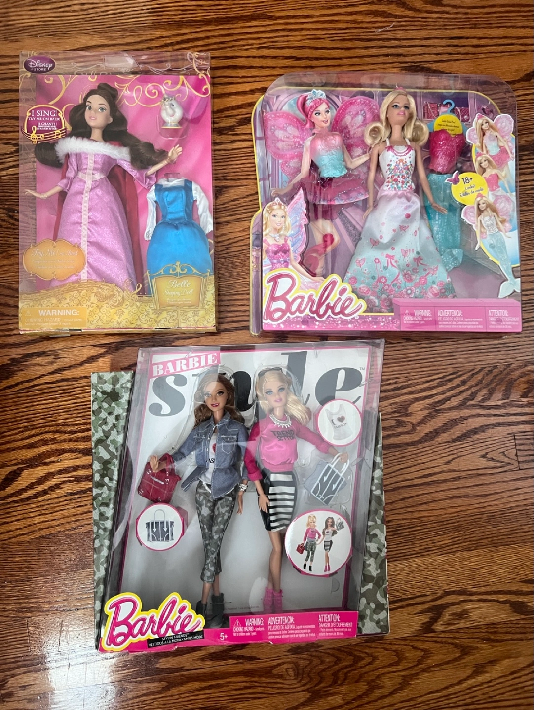 never opened barbie sets and beauty and the beast set. Dolls were given as a gift but never used. Belle plays a song and still works.