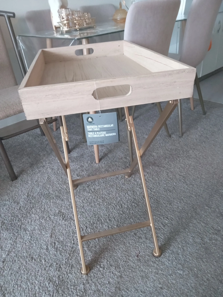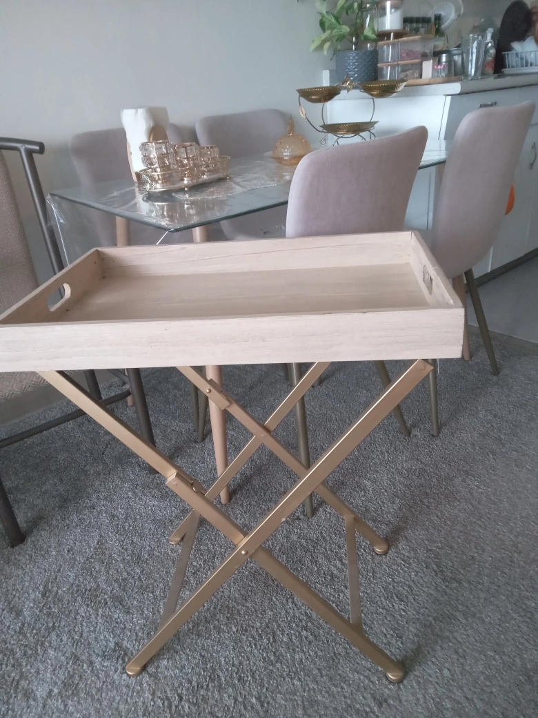 Brand new Foldable serving tray. Light coloured wood top. Gold metal legs. Perfect for serving or as a side table.