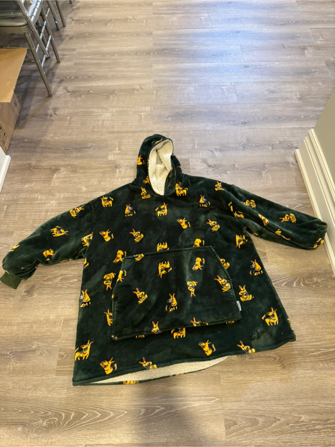Super soft hooded blanket sweatshirt with a fun green and yellow dog print. It features a cosy sherpa-lined hood and a large front pocket. Perfect for chilly evenings! Oodie $25