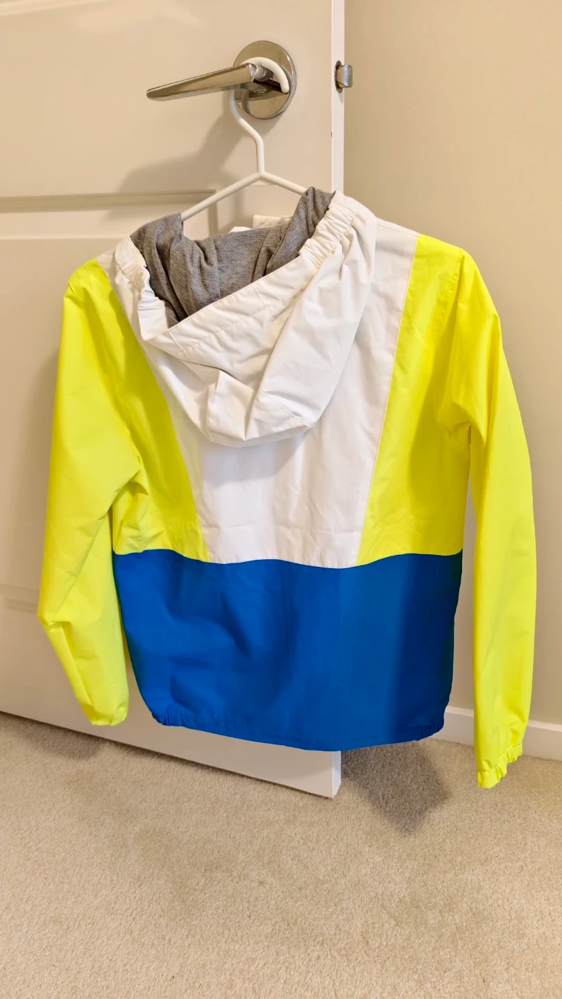 Selling a new Mountain Warehouse kids water resistant jacket in size 14. It's a colour block jacket with yellow, white and blue. Perfect for outdoor adventures!