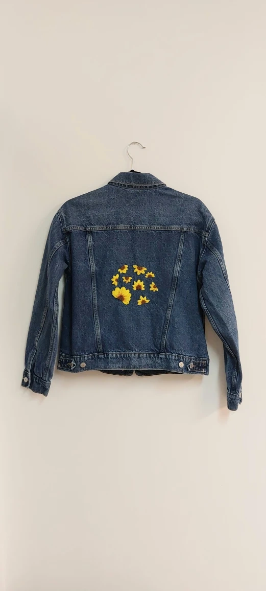 Here's a cute Old Navy denim jacket in a size medium! It has a fun sunflower design on the back (handmade embroidered), adding a touch of whimsy to a classic style in winter!