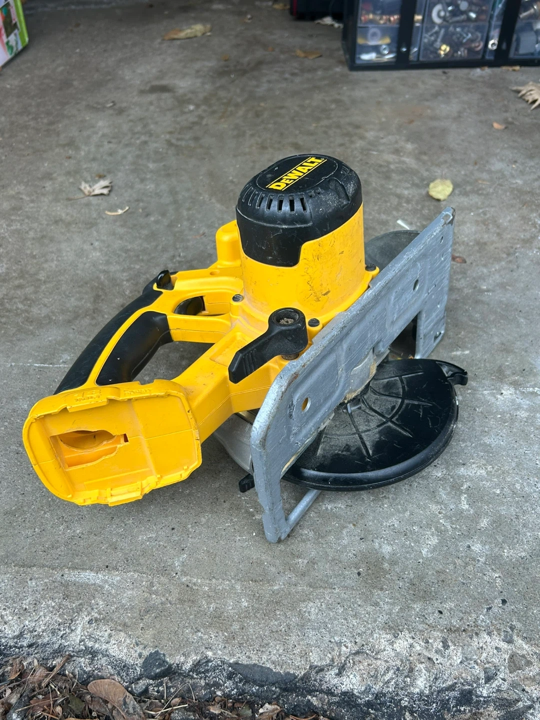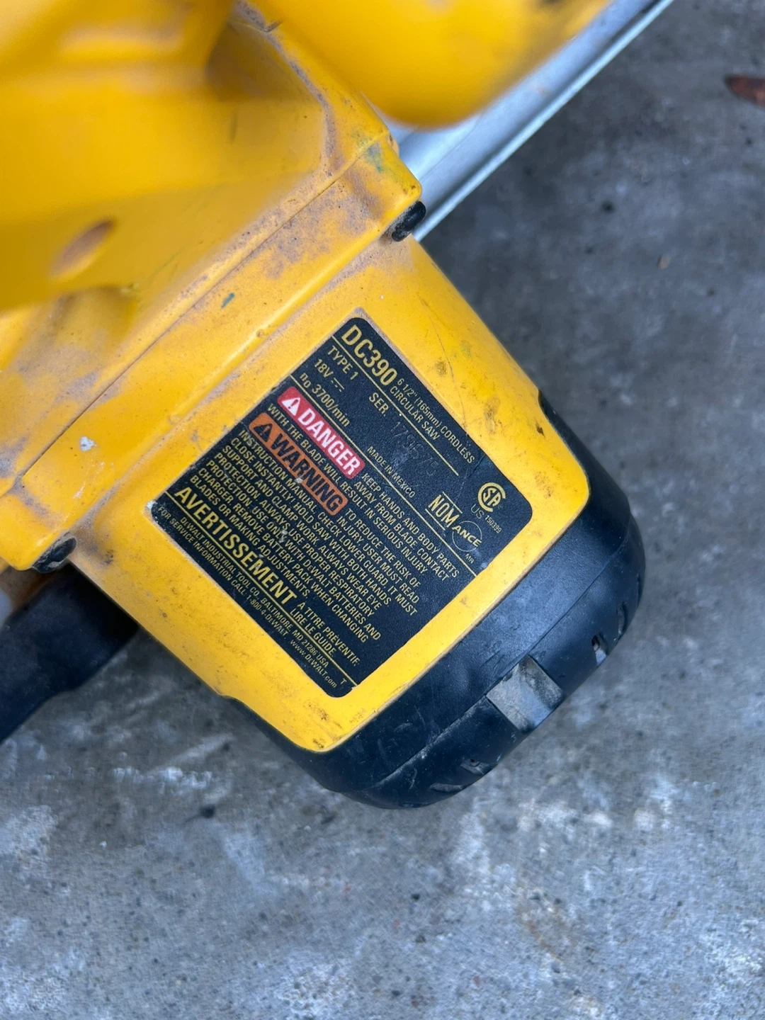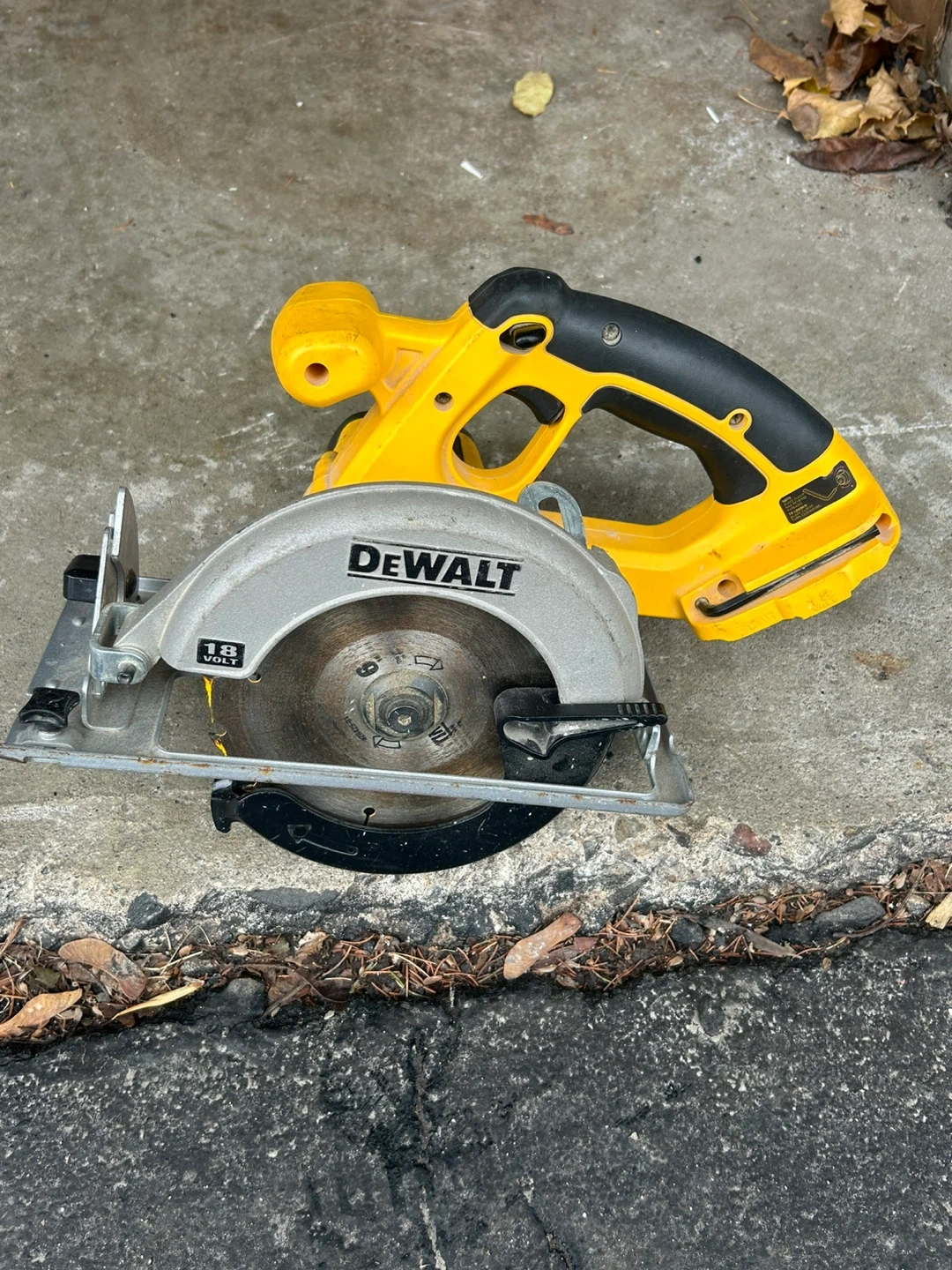 This is a DeWalt DC390 18V cordless circular saw with a 6 1/2" blade. It features a variable speed of 0-3700 RPM. It's a perfect tool for cutting wood and other materials depending on the type of blade you use.