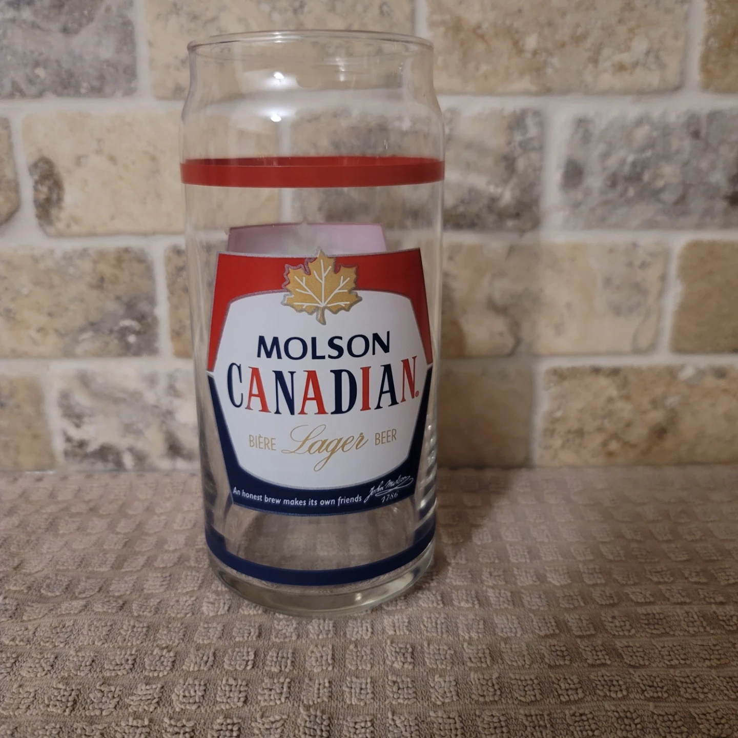 This is a Molson Canadian lager beer glass. It features the brand's classic red and blue design. It's made of clear glass. This would be great for enjoying a cold one!