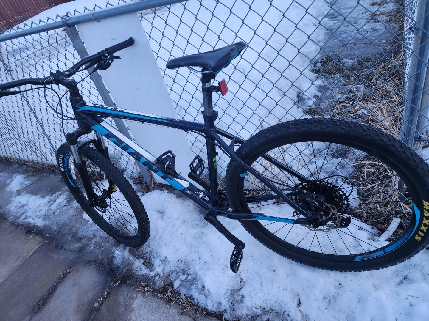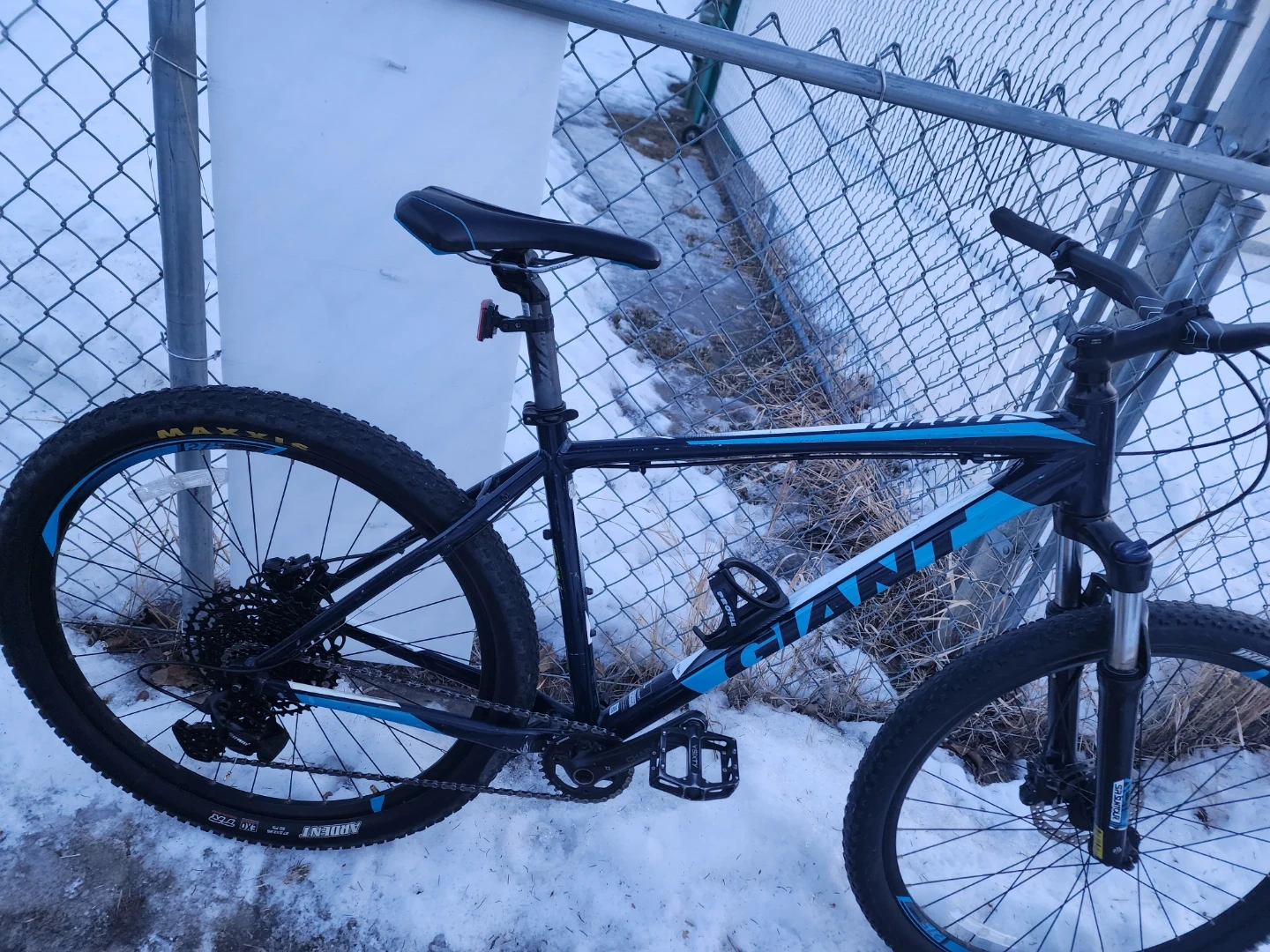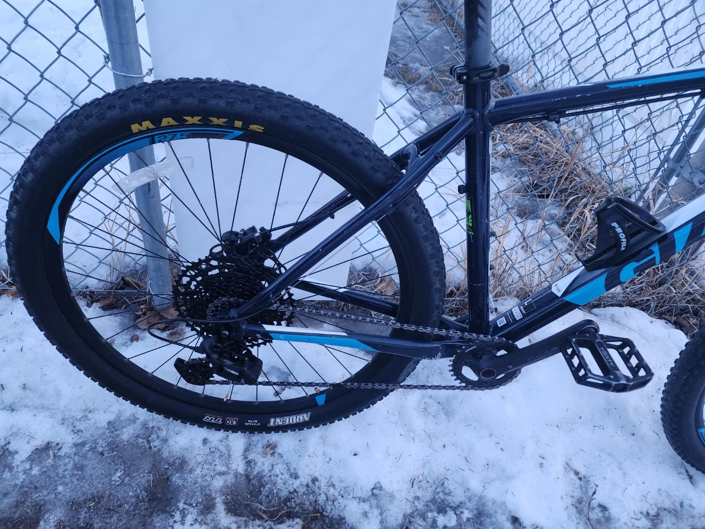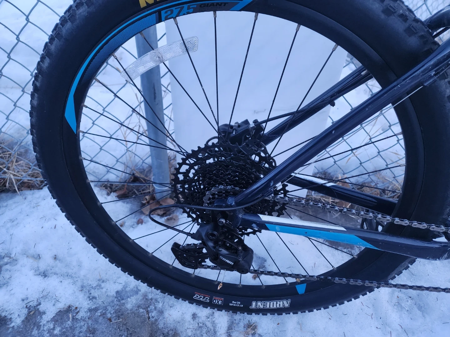 This is a Giant P-27.5 mountain bike with an aluminum frame. It has disc brakes. New brakes caliper and pads and SRAM shifter and rear derailleur. The tires are Maxxis Ardent. Upgrade to 1by11. Lot of life left on drive train. Fully refurbished. Put together by professional bike mechanic