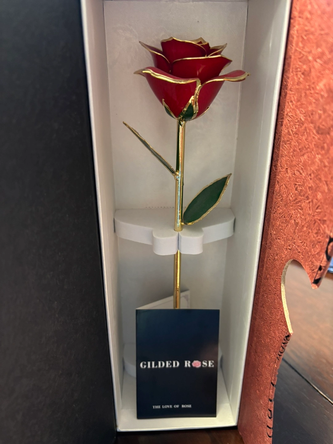 Red rose dipped in gold, comes in a black and red box with the words 'Love' and 'Rose' repeated on the exterior. Includes a small card that reads 'Gilded Rose, The Love of Rose'.