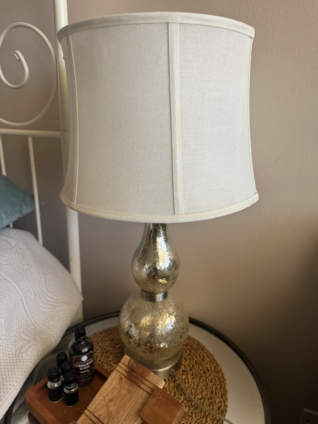 This table lamp features a mercury glass base with a textured fabric shade. Its elegant design provides a warm glow. Perfect for a bedside table or living room accent!