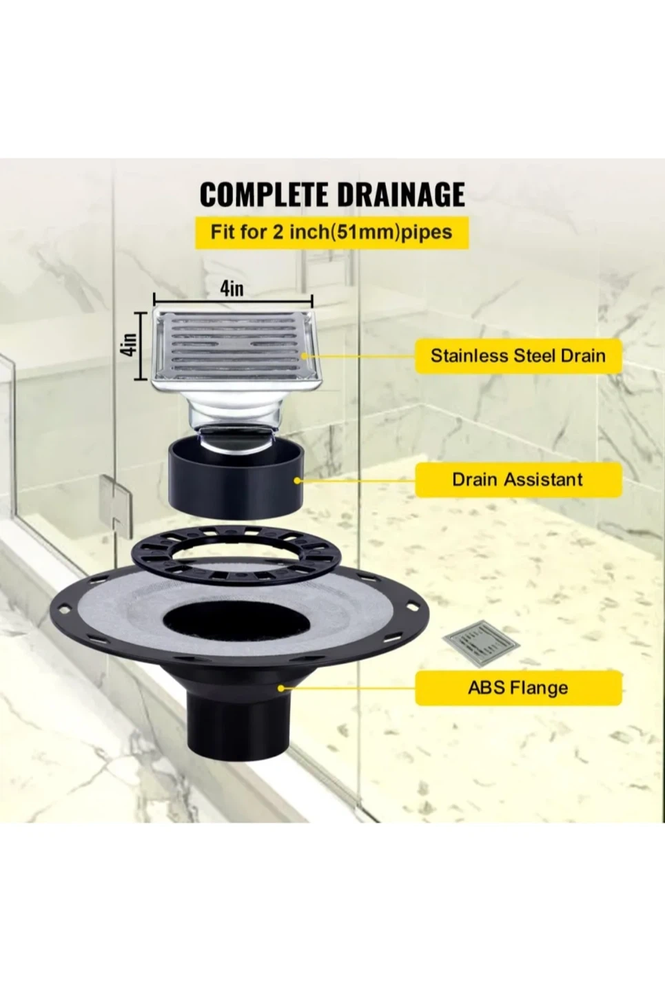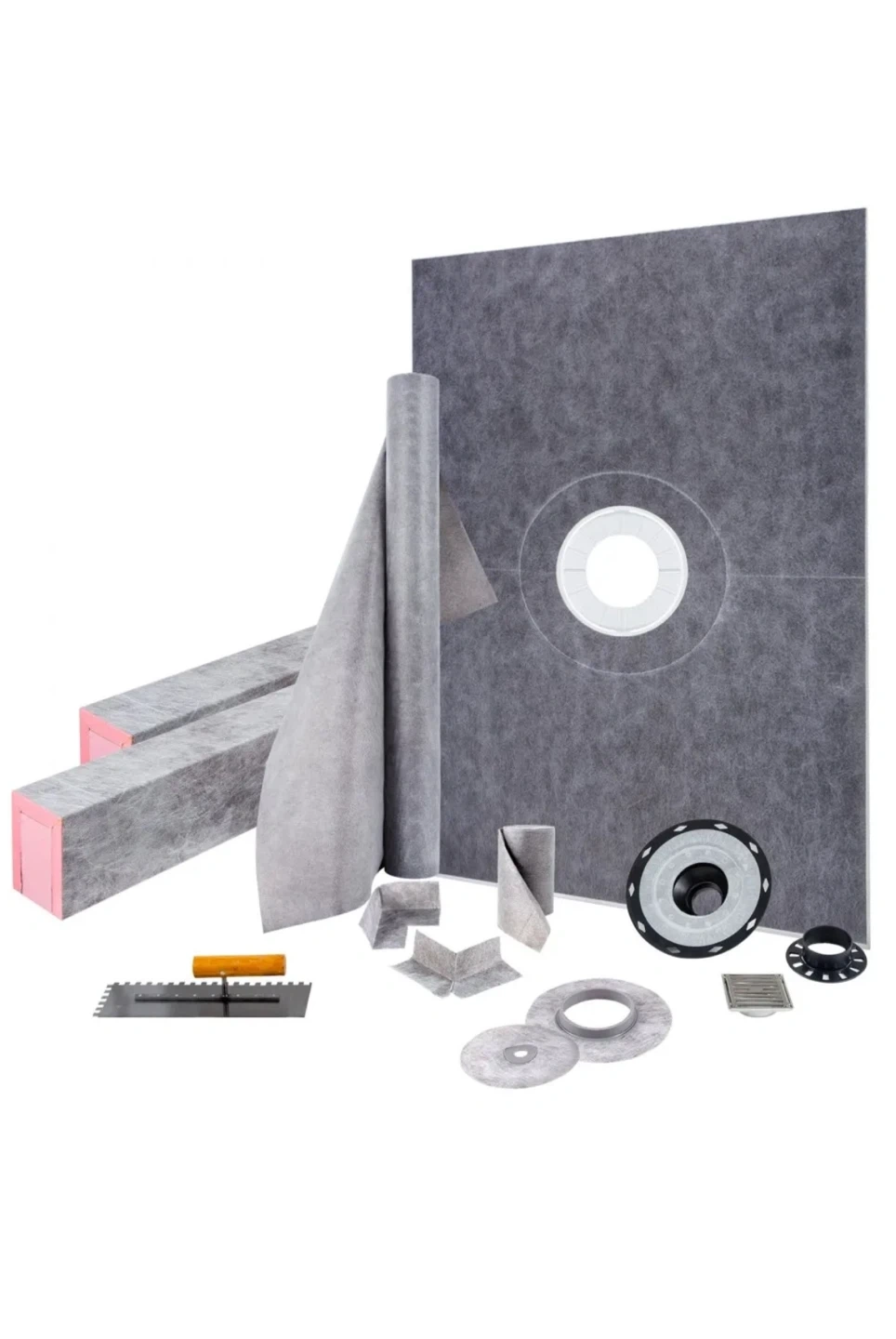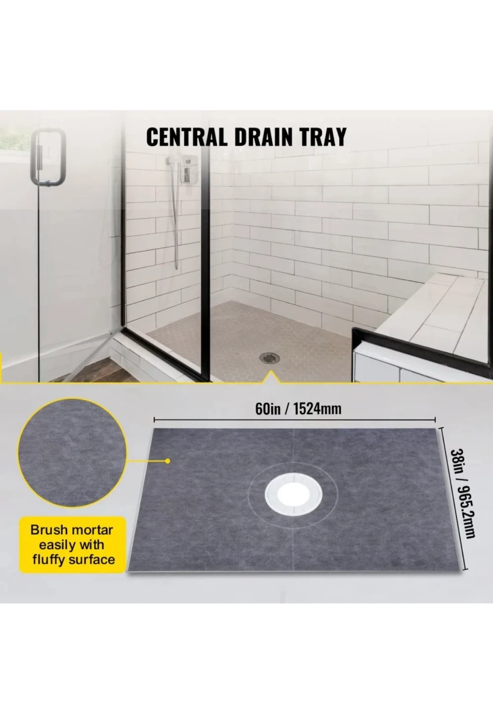 Selling a VEVOR shower system kit. It includes a square-tooth trowel, central drain tray (60in/1524mm x 38in/965.2mm), HDPE membrane (3.3ft/1m x 32.8ft/10m and 5in/12.7mm x 32.8ft/10m), 4 inside corners, 2 outside corners, and complete drainage for 2 inch (51mm) pipes with a stainless steel drain and ABS flange