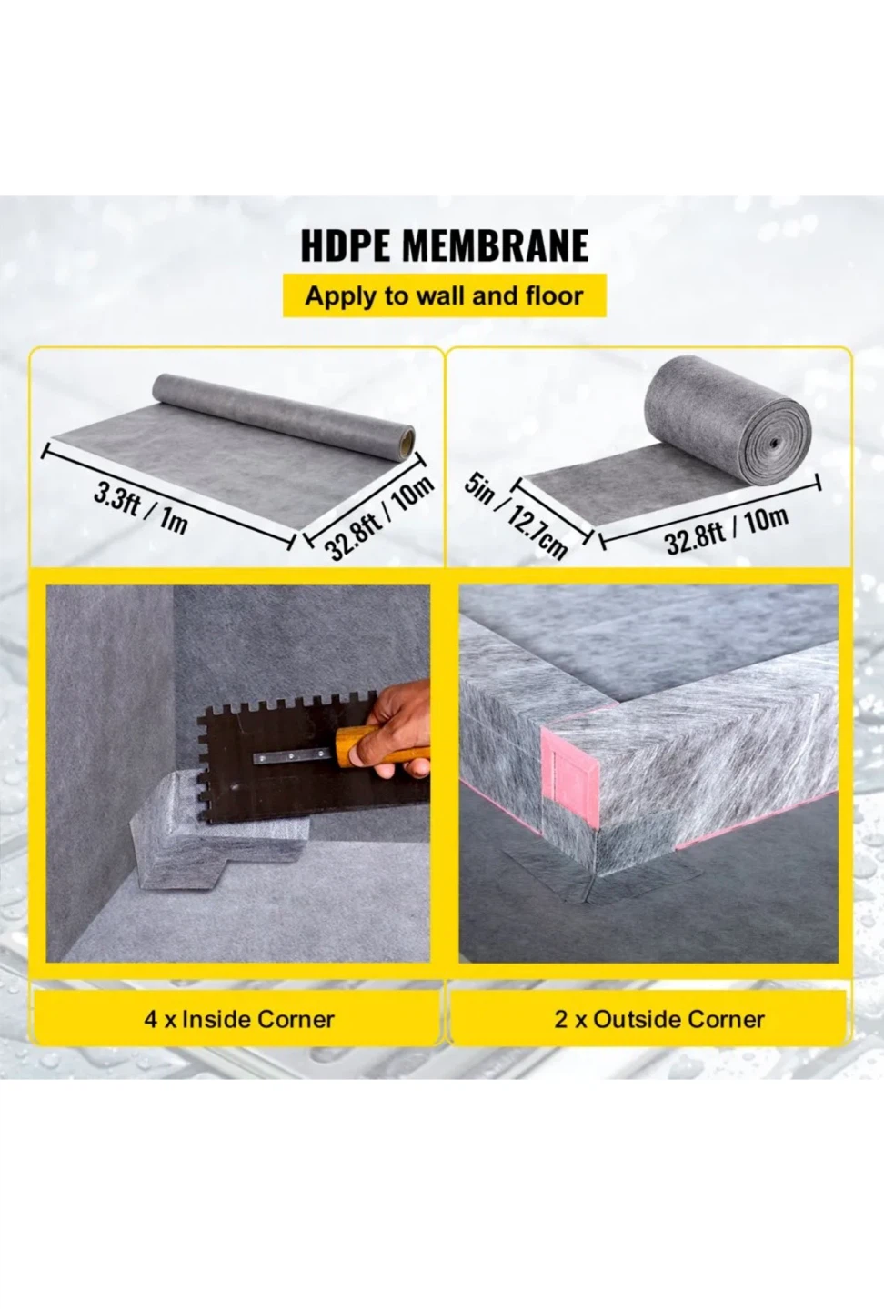 Selling a VEVOR shower system kit. It includes a square-tooth trowel, central drain tray (60in/1524mm x 38in/965.2mm), HDPE membrane (3.3ft/1m x 32.8ft/10m and 5in/12.7mm x 32.8ft/10m), 4 inside corners, 2 outside corners, and complete drainage for 2 inch (51mm) pipes with a stainless steel drain and ABS flange