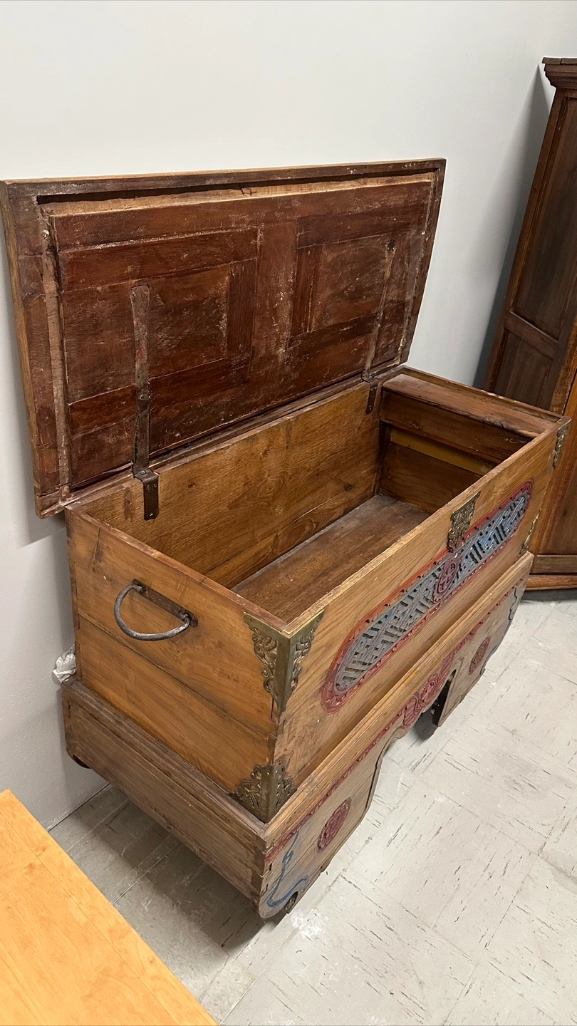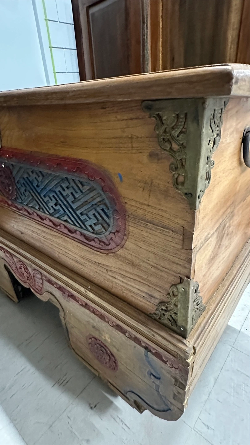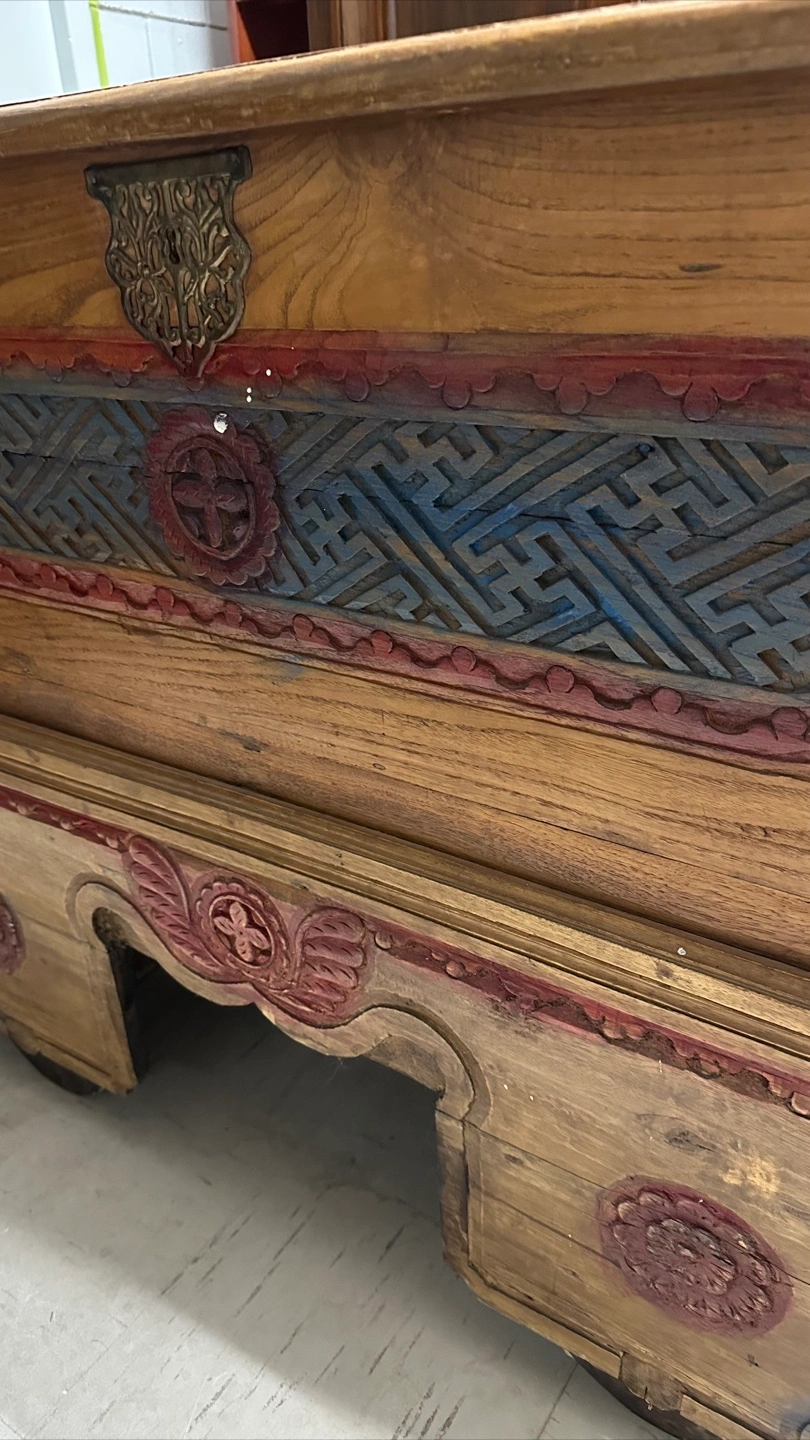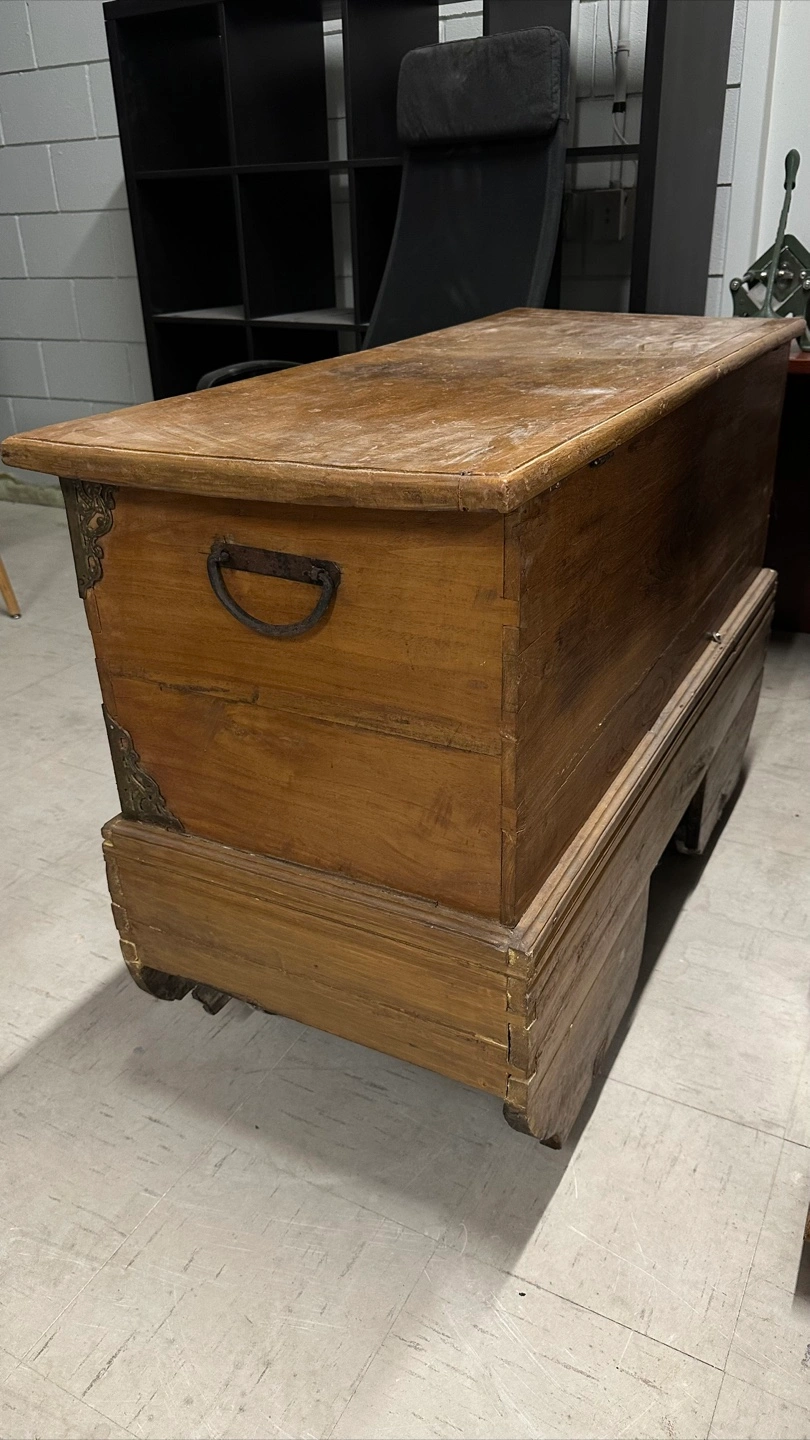 Selling a unique wooden storage chest with a beautiful antique design. This chest has a rustic charm and would be a great addition to any home looking for a vintage touch. It features decorative carvings and metal accents, making it a standout piece. Perfect for storing blankets, linens, or other household items!