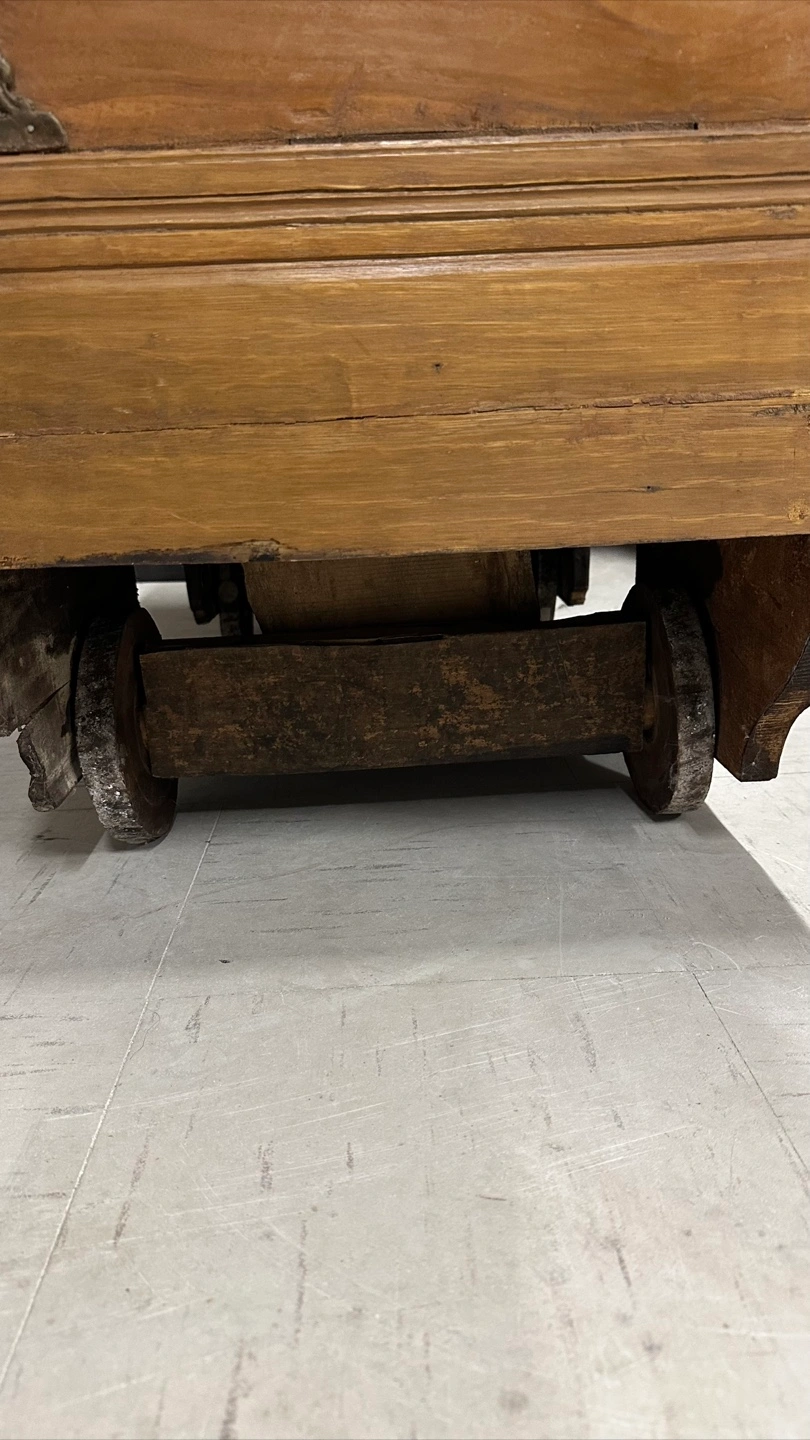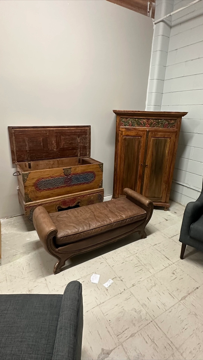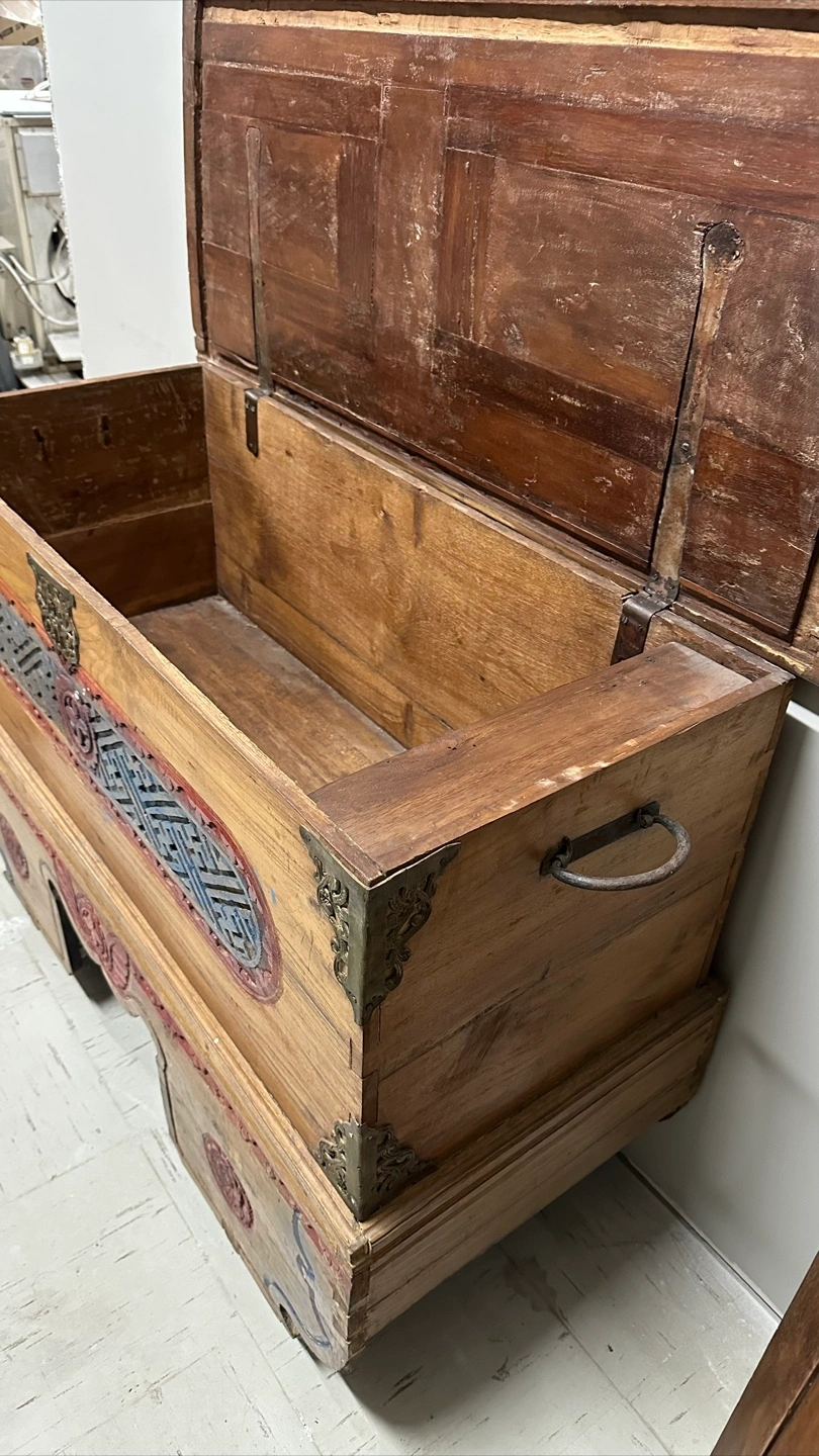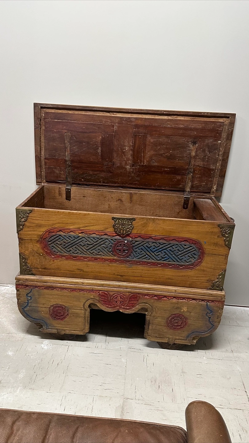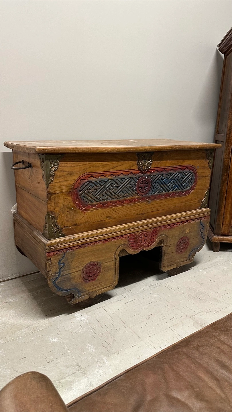 Selling a unique wooden storage chest with a beautiful antique design. This chest has a rustic charm and would be a great addition to any home looking for a vintage touch. It features decorative carvings and metal accents, making it a standout piece. Perfect for storing blankets, linens, or other household items!