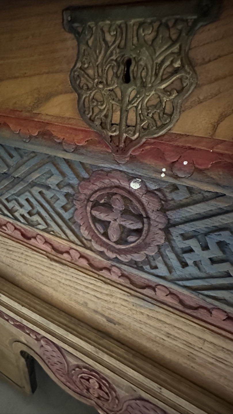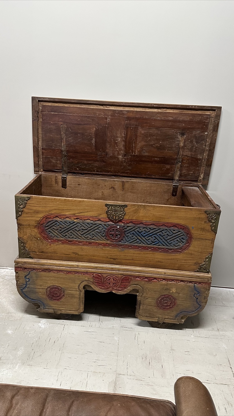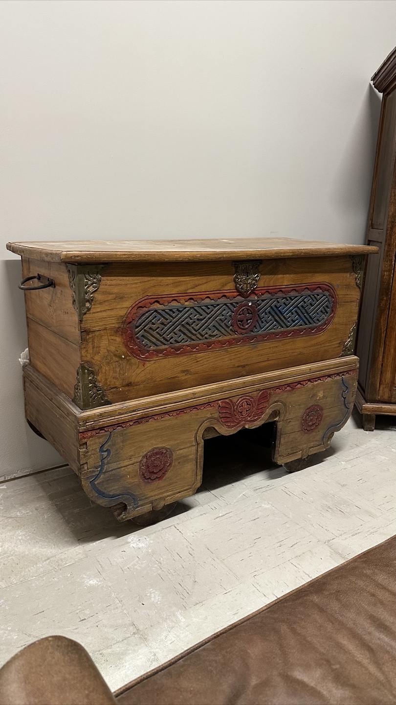 Selling a unique wooden storage chest with a beautiful antique design. This chest has a rustic charm and would be a great addition to any home looking for a vintage touch. It features decorative carvings and metal accents, making it a standout piece. Perfect for storing blankets, linens, or other household items!