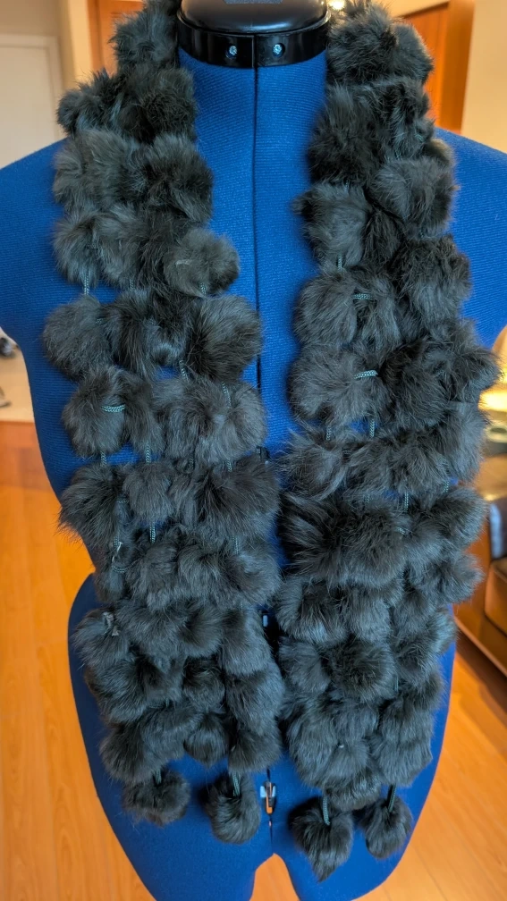 Selling a fur scarf with pom poms. It's a unique and stylish accessory to keep you warm and add a touch of fun to your outfit!
