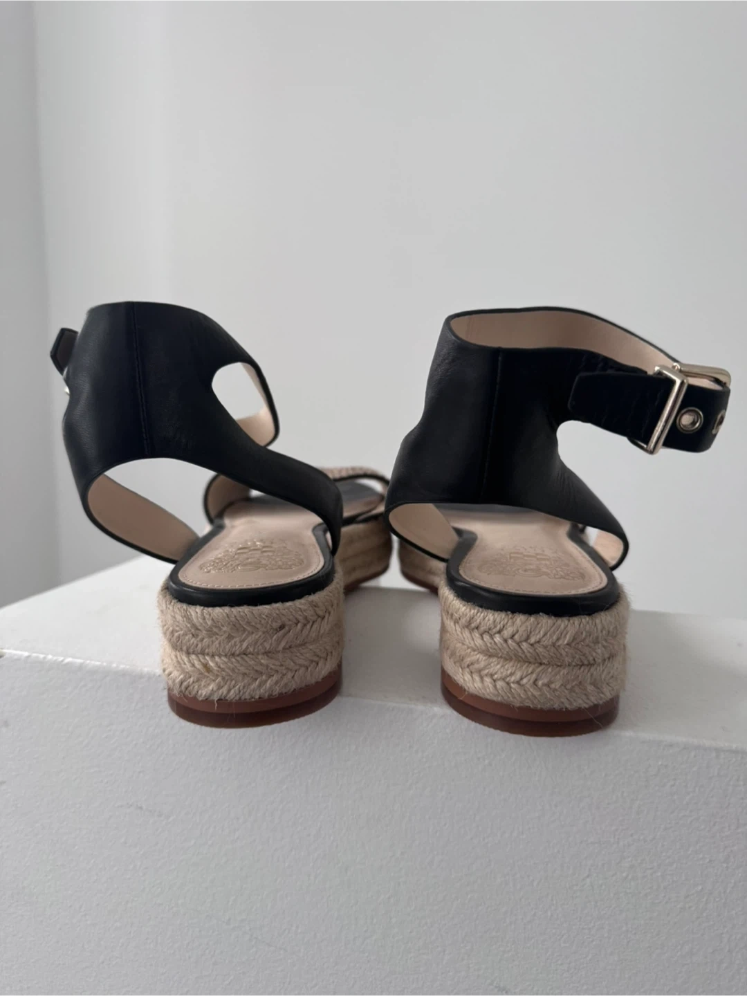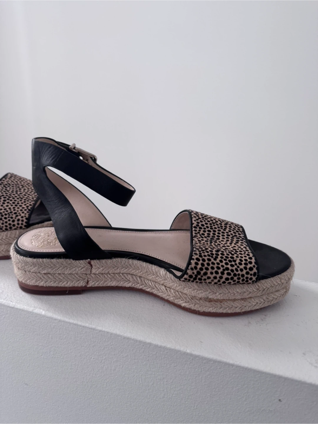 Vince Camuto espadrille wedge sandals with a trendy leopard print, pony hair strap. Features a comfortable ankle strap with buckle closure. Platform sole with braided jute detail. Never worn