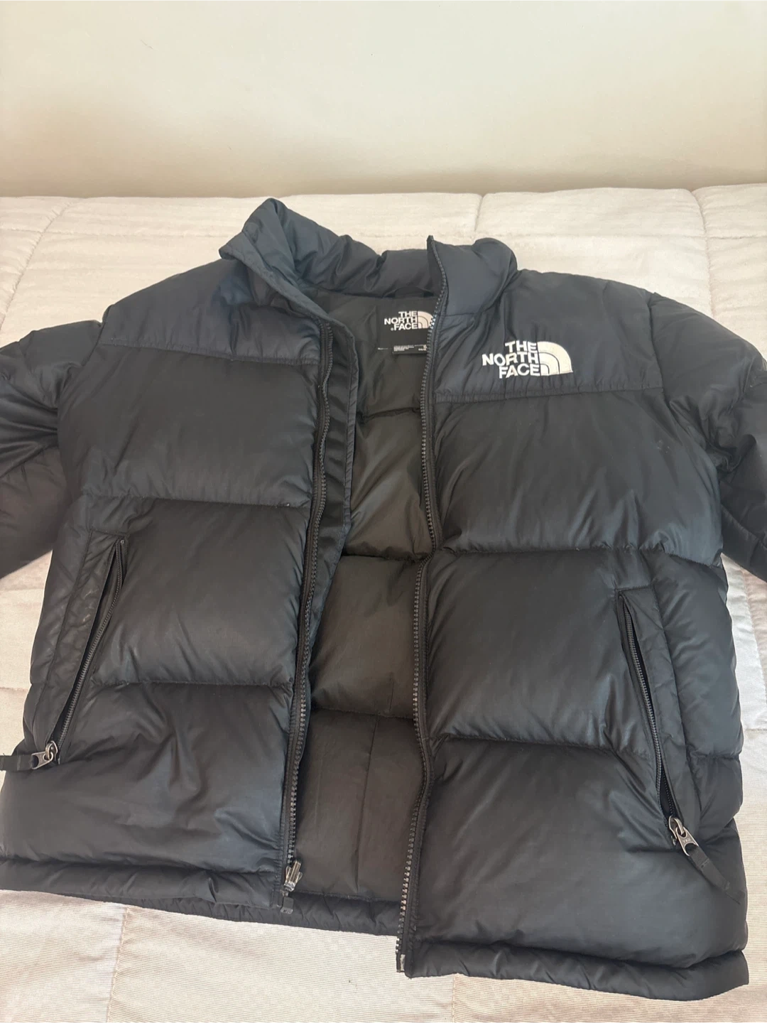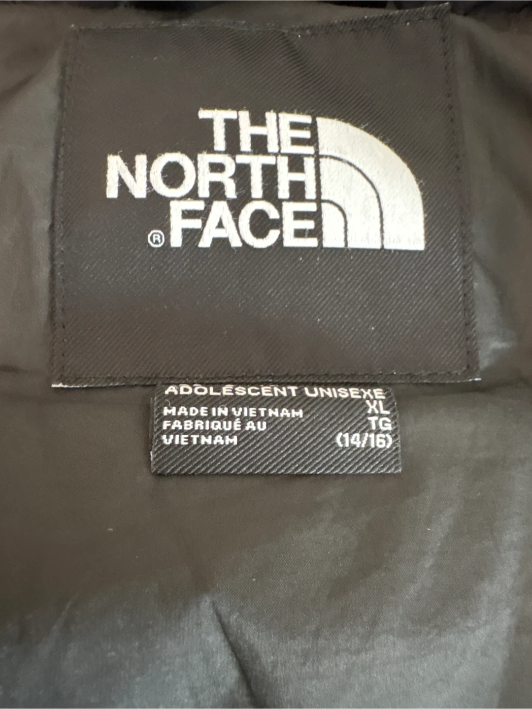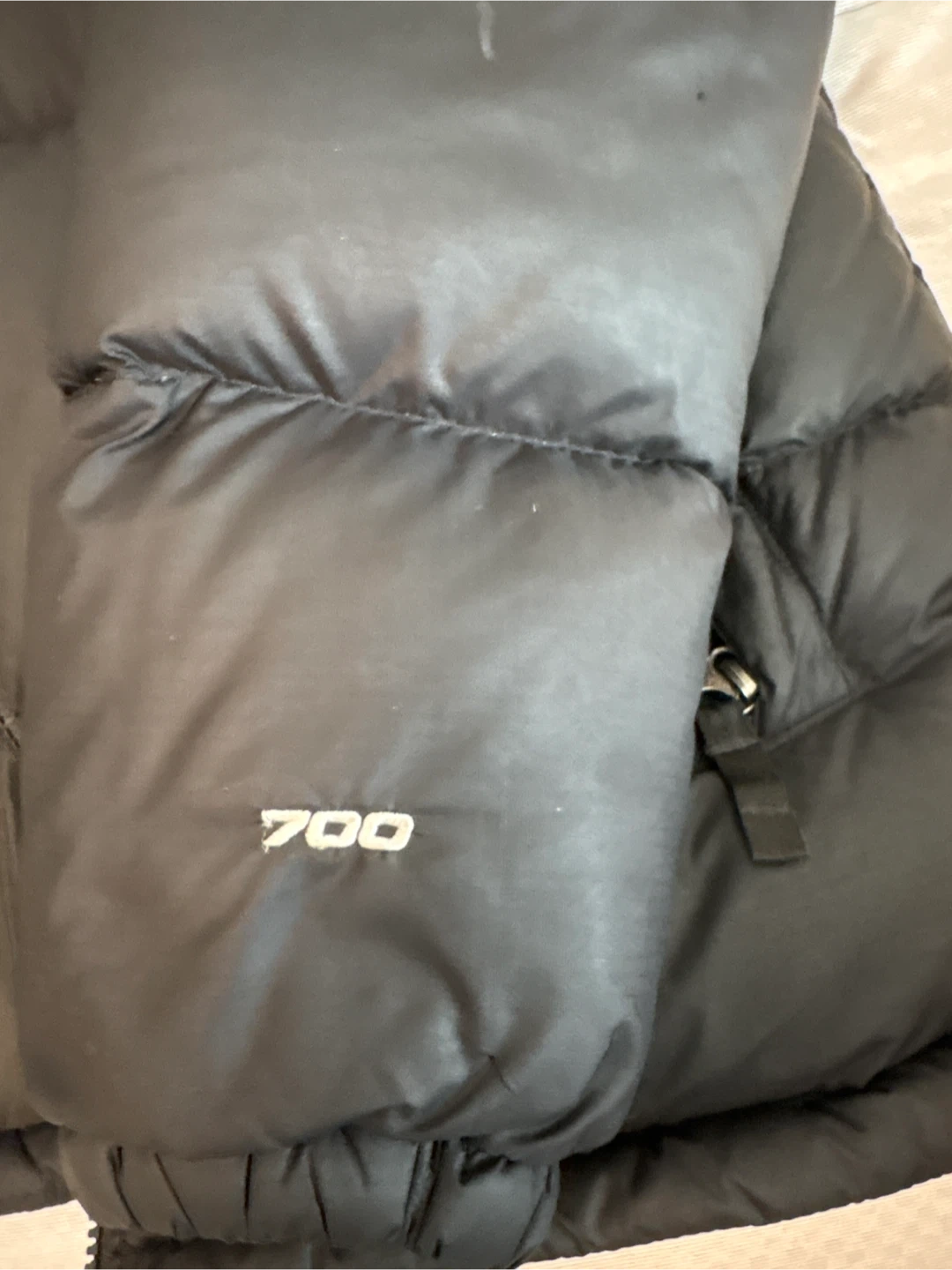 This is a black puffer jacket from The North Face. It's a size XL and has "700" printed on the sleeve. This jacket is suitable for cooler weather.